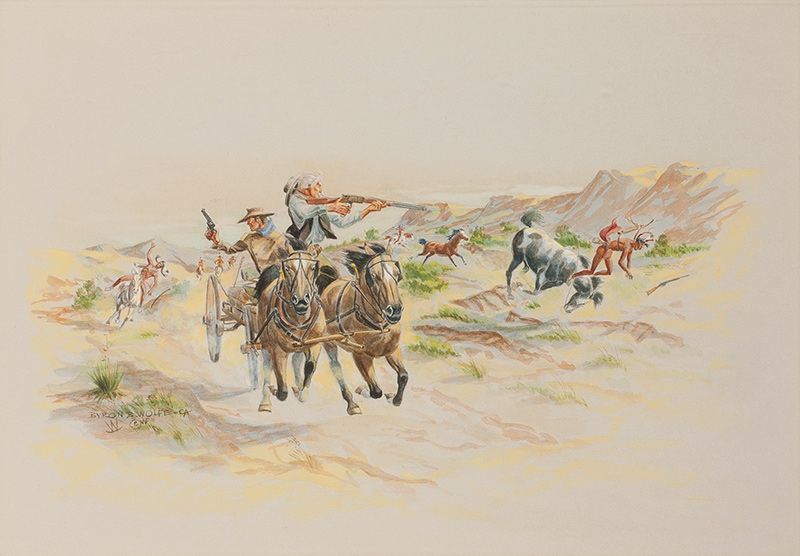 Byron Wolfe, 1904 - 1973 CAA | Signed: In image, Byron B. Wolfe CA (Rockin' W Brand) © WF. On mat, 'Cuttin' Down the Odds - Texas Style' l/l; "From the Sketch Book of Byron B. Wolfe" with remarque, l/r, l/l | Media: Gouache on paper | Dimensions: 11 by 16 inches