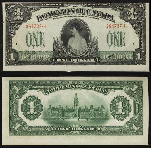 Cutting error note. 1917 $1 . DC-23a-i. Crisp Original Princess Patricia $1 example. The note is bright with full embossing with a light cutting error. Cut with the top of the lower note (from sheet) showing in the margin. UNC with very light handli