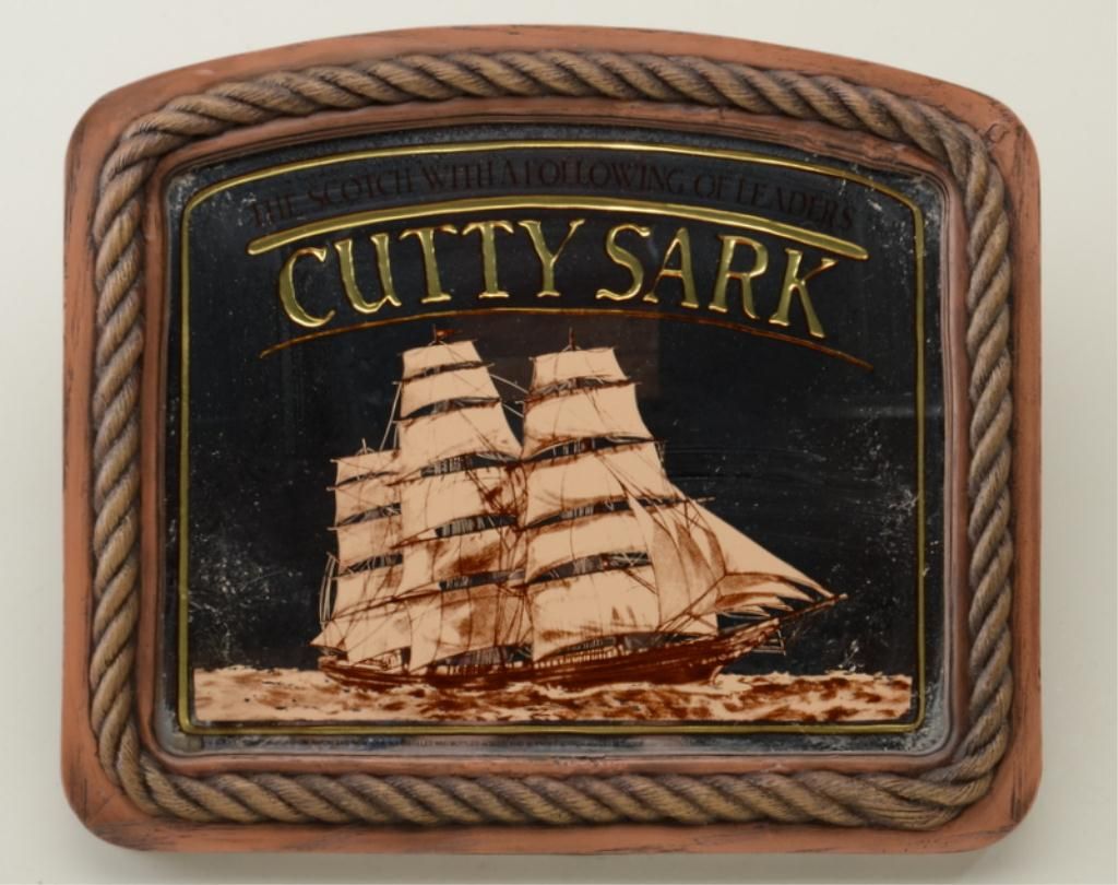 Cutty Sark Scotch bar mirror in faux wood frame approx. 15” x 18” in good condition. Est.: $25-$50.