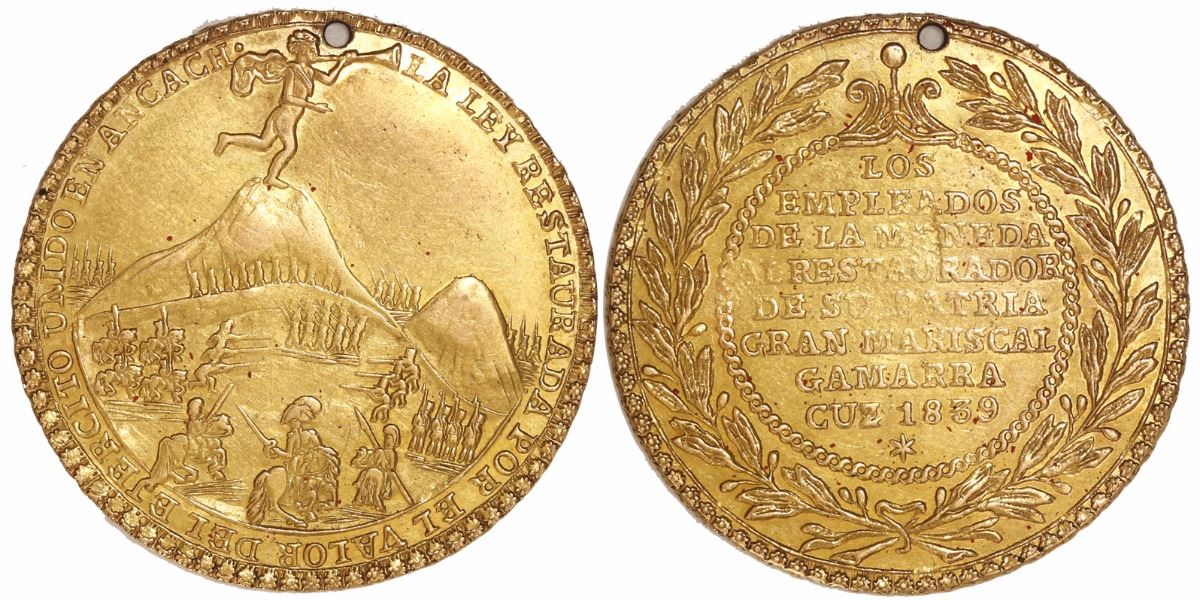 Cuzco, Peru, 8 pesos-sized gold medal, 1839, victory by General and President Agustin Gamarra over the Peru-Bolivian Confederation at the battle of Yungay in Ancach province, extremely rare metal. 14.89 grams, 32mm. Obverse with trumpeting cherub on hill above battle scene inside legend LA LEY RESTAURADA POR EL VALOR DEL EJERCITO UNIDO EN ANCACH; reverse with LOS / EMPLEADOS / DE LA MONEDA / AL RESTAURADOR / DE SU PATRIA / GRAN MARISCAL / GAMARRA / CUZCO 1839 / * within chain and wreath. XF with slightly weak centers, tiny hole at top, one of only four specimens known in gold.