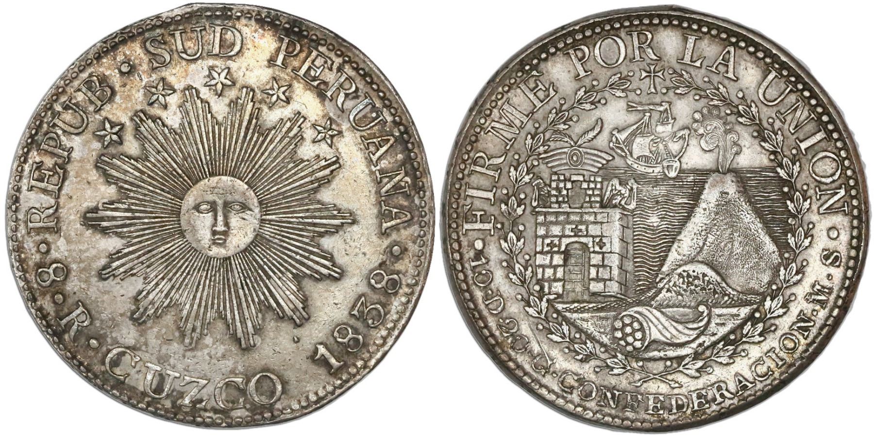 Cuzco, Peru, 8 reales, 1838MS. KM-170.4. 26.01 grams. AU- with light rainbow toning over muted luster, popular and attractive design.