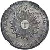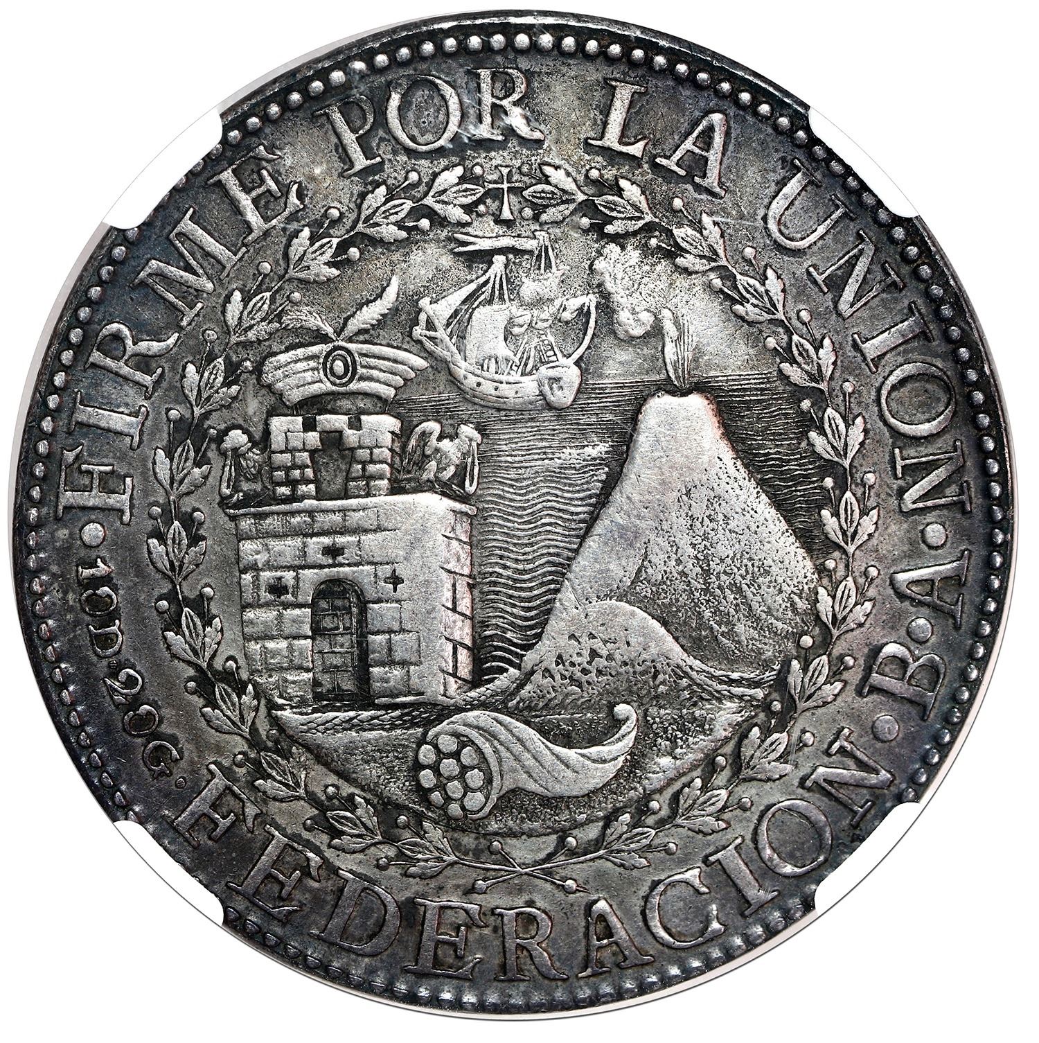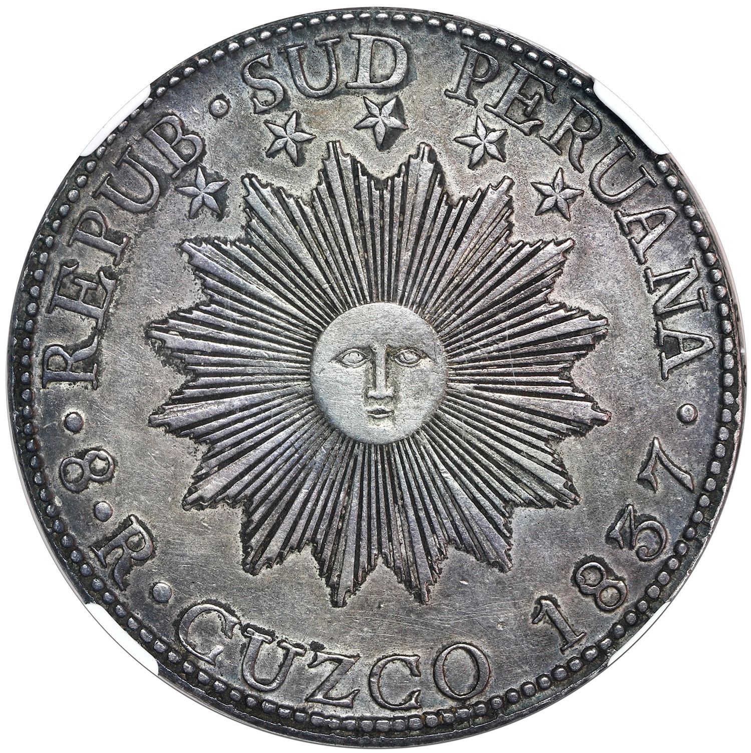 Cuzco, Peru (Republic of South Peru), 8 reales, 1837 BA, FEDERACION, incuse edge-lettering, NGC XF 45. KM-170.1. The symbolic artistry that characterizes this series is even more substantial on the silver, like we see here, with the volcano-Qorikancha motif encircled with a wreath and well toned for contrast, the sunface on the obverse with just rays (no flags) and on this issue topped with five stars as from the REPUB. SUD PERUANA (see the previous three lots) and with rosy-toned fields, traces of encrustation around details. Note: The printed catalog (only) shows the wrong photo for this lot.