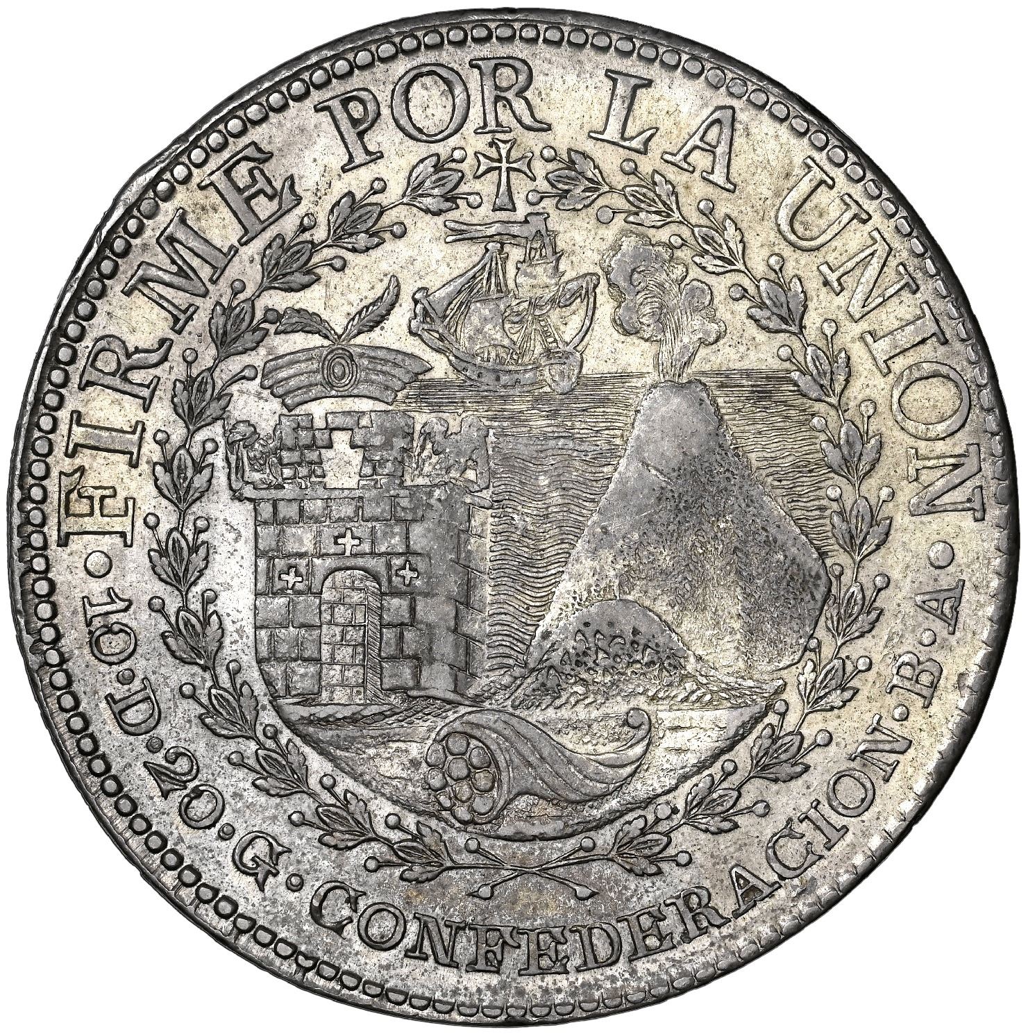 Cuzco, Peru (Republic of South Peru), 8 reales, 1838 BA, CONFEDERACION, NGC AU 53. KM-170.4. Choice for the assigned grade, with very light mauve and green-gold toning over muted luster and minimal high-point wear, problem-free strike and popular for its highly symbolic design. Please use this link to verify the certification number
