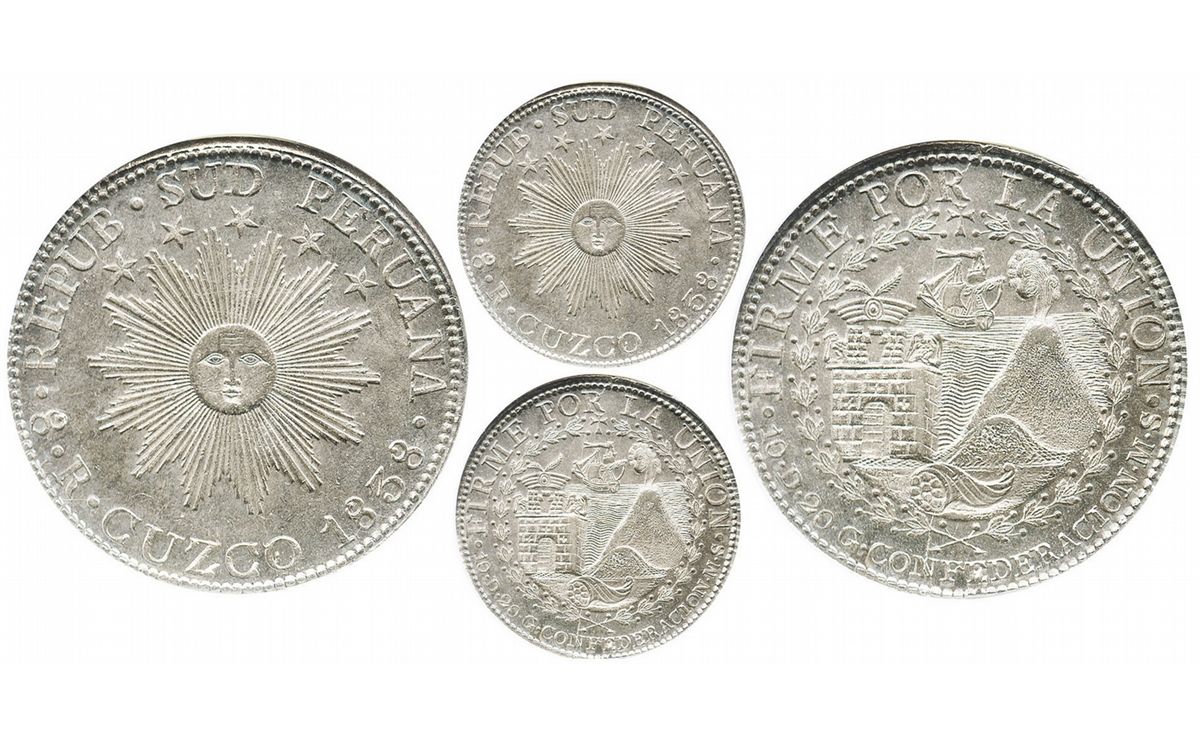 Cuzco, South Peru, 8 reales, 1838MS, CONFEDERACION type, encapsulated NGC MS 63, tied for finest known specimen graded by NGC. KM-170.4. Exceptional specimen of a popular 3-year issue with one of the most artistic designs of post-Independence Latin American coinage, this piece highly lustrous and well struck, in fact better than the Whittier example (one of the 2 other known MS 63's) that had a weaker sunface, with just a few minor bagmarks keeping it from higher grade, also with odd die-crack on reverse, really a lovely coin all around and worthy of its lofty status atop the census.