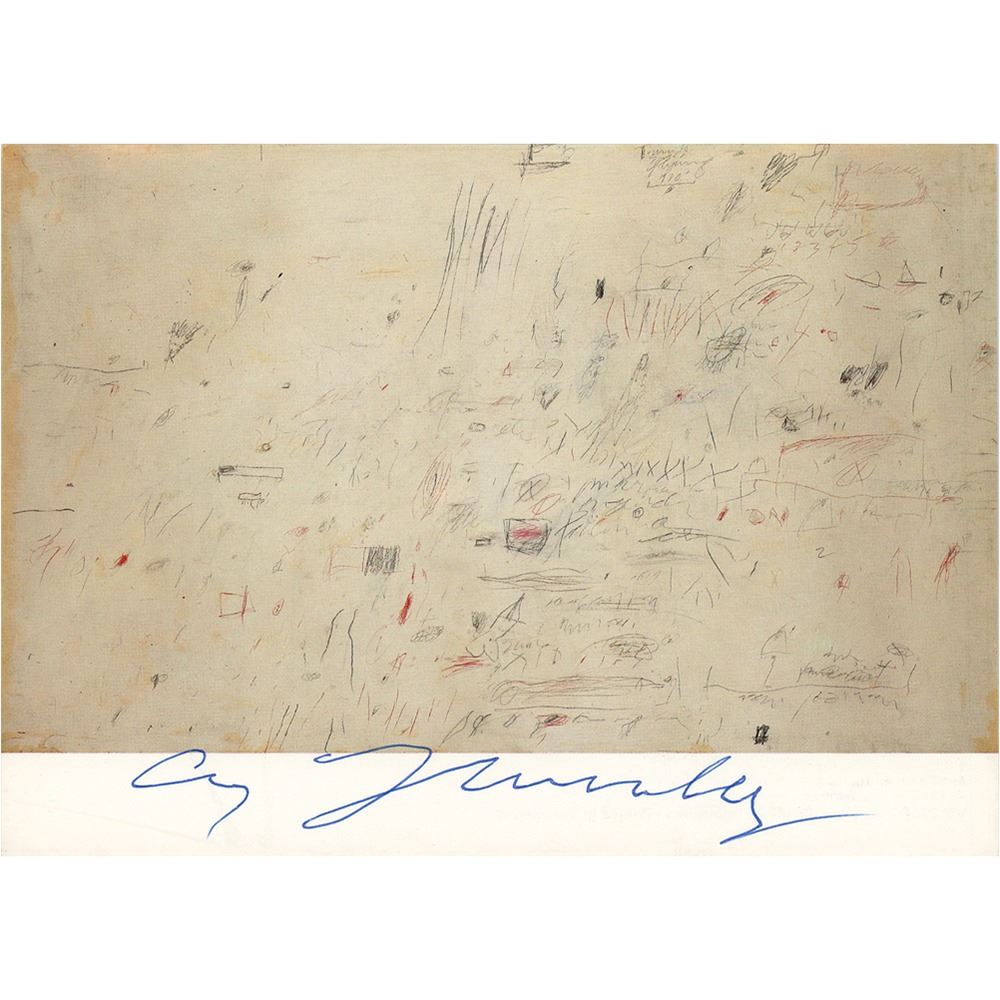 Color semi-glossy 5.75 x 4.25 postcard of an untitled Cy Twombly painting from 1959, signed in the lower border in blue ballpoint. In very fine condition.