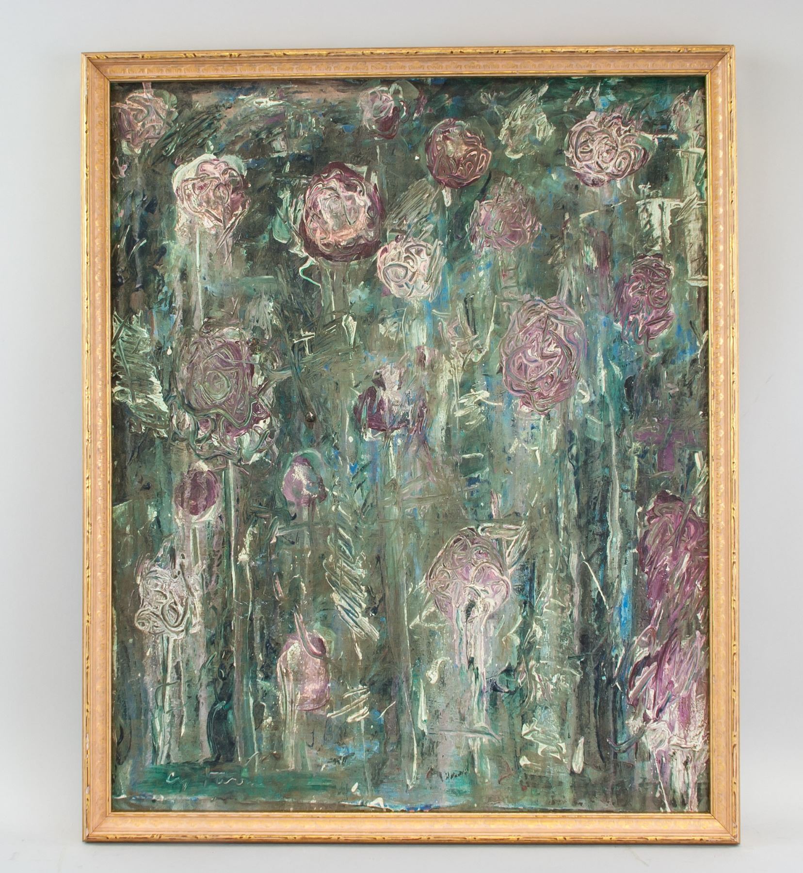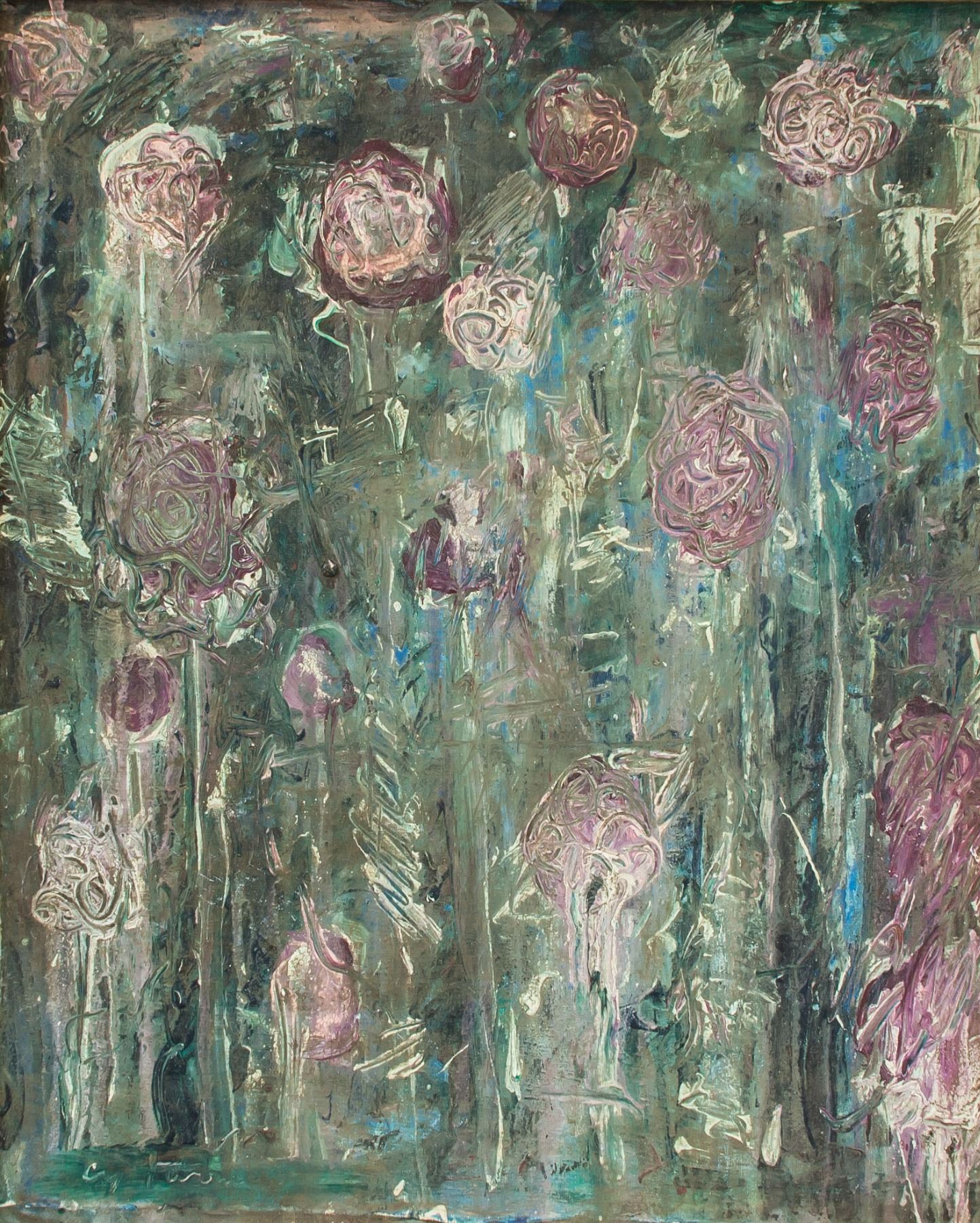 Oil on canvas abstract expressionist painting. Signed and attr. Cy Twombly (American, 1928-2011) on lower left corner. 21.75 x 17.5 in (55.2 x 44.5 cm). Cy Twombly emerged in the 1950s, developing a characteristic painting style of expressive drips and active, scribbled, and scratched lines. “My line is childlike but not childish,” he once said. “It is very difficult to fake…to get that quality you need to project yourself into the child's line. It has to be felt.” Early influences included Willem de Kooning, Franz Kline, Jackson Pollock, and Robert Motherwell, but more formative would be his relationships with Robert Rauschenberg and Jasper Johns, along with whom he would distance himself from the dominance of Abstract Expressionism. Twombly's work also appeared in one of the first exhibitions to explore ideas of Minimalism—“Black, White, and Grey” (1964)—along with Agnes Martin, Frank Stella, and Andy Warhol. In addition to his paintings, which were sometimes dismissed as "high-art graffiti," he produced sculptures assembled from found objects, clay, and plaster, painted white to suggest an affinity to Classicism.