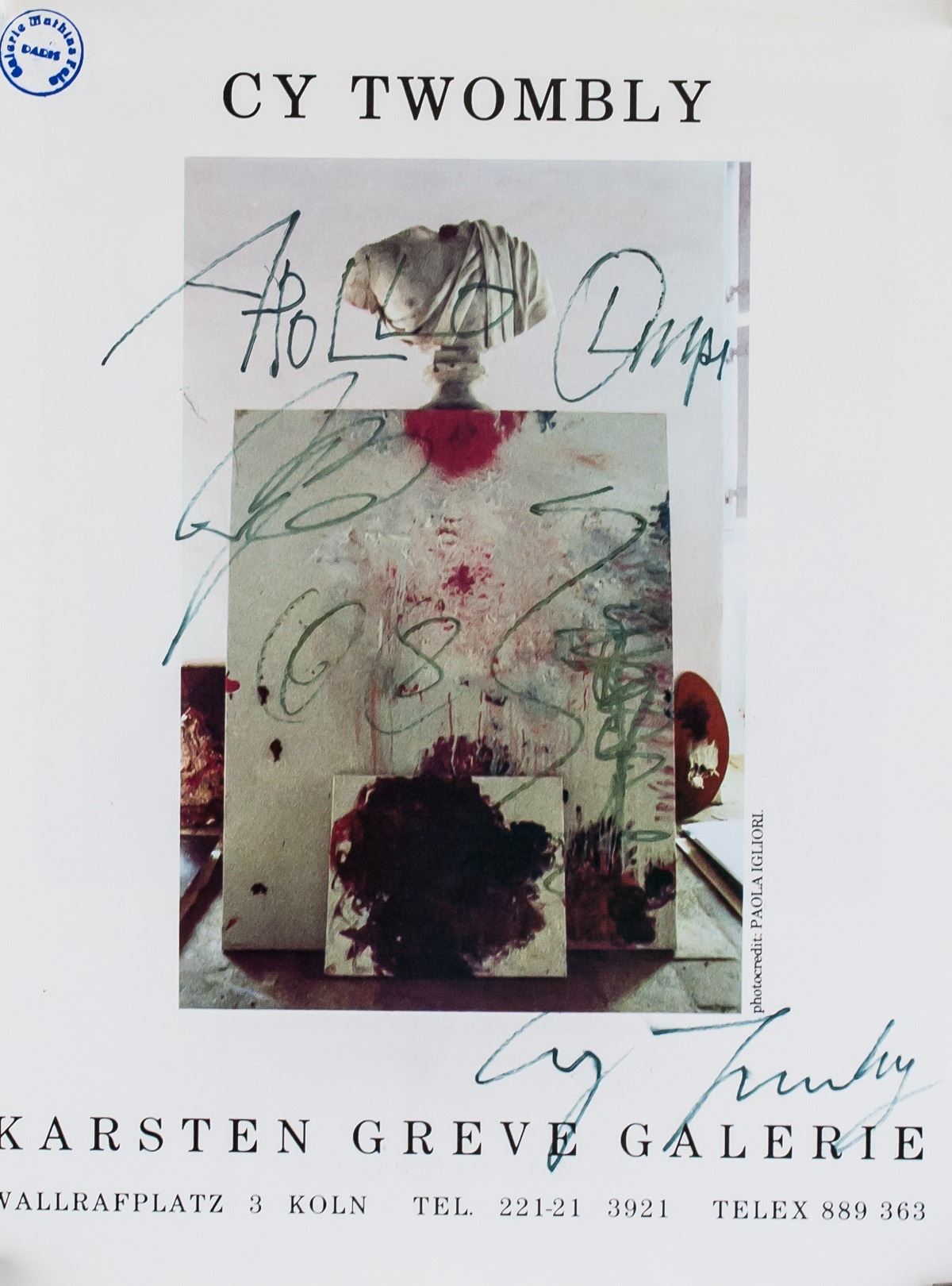 Autographed page featuring a print of work by Cy Twombly. Signed Cy Twombly in red ink on the lower right corner. Inscribed illegibly in handwriting. Karsten Greve Galerie. Stamped on the upper left corner, Galerie Mathias Fels PARIS. Inscribed 1987 in ink. Attributed to Cy Twombly (1928-2011, American). 28.2 x 21.5 cm (11 x 8.5 in)
