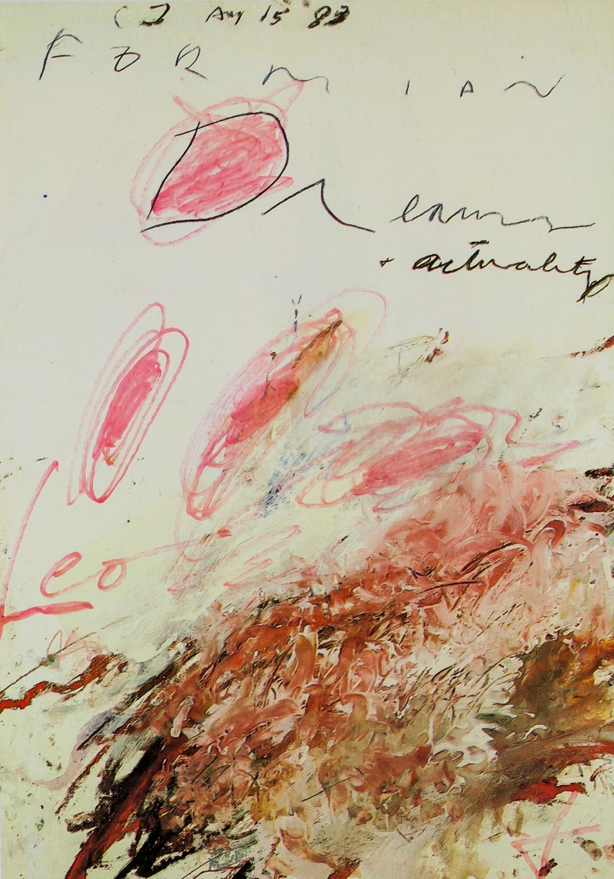 Autographed page featuring a print of an untitled work of Cy Twombly. Signed Cy Twombly in red ink on the lower right corner. Karsten Greve. Stamped on the upper left corner, Galerie Mathias Fels PARIS. Inscribed 1983 in ink. Attributed to Cy Twombly (1928-2011, American). 28.2 x 21.5 cm (11 x 8.5 in)
