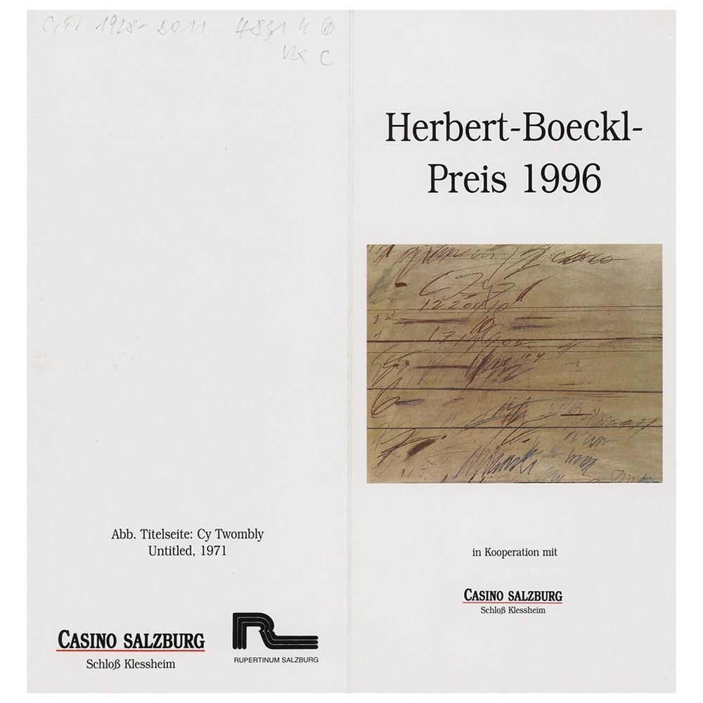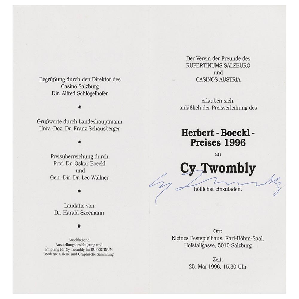 German-language bi-fold brochure for the Herbert Boeckl Prize of 1996, measures 7.75 x 8.25 open, signed inside in blue ballpoint by Cy Twombly, who was awarded the prize on May 25, 1996. In very fine condition.