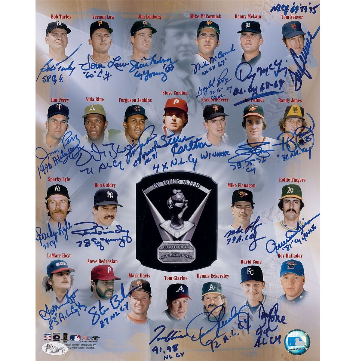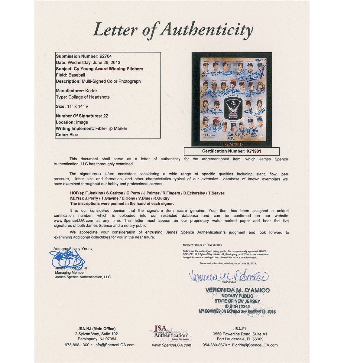 Color satin-finish 11 x 14 photo of a group of Cy Young Award winners, signed by 22 pitchers in blue felt tip, including: Tom Seaver, Steve Carlton, Bob Turley, Vern Law, Jim Lonborg, Mike McCormick, Denny McLain, Jim Perry, Vida Blue, Fergie Jenkins, Gaylord Perry, Jim Palmer, Randy Jones, Sparky Lyle, Ron Guidry, Mike Flanagan, Rollie Fingers, LaMarr Hoyt, Steve Bedrosian, Tom Glavine, Dennis Eckersley, and David Cone. In fine condition, with a JSA label affixed to the left left corner. Accompanied by a full letter of authenticity from JSA.