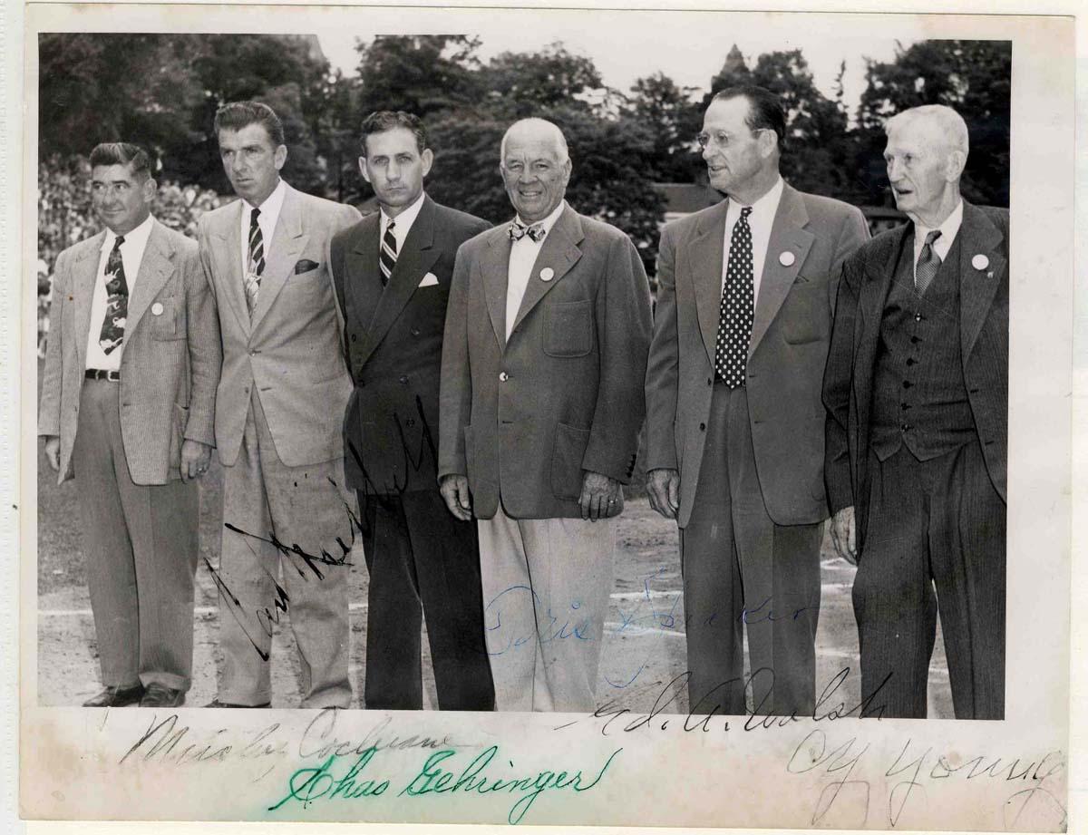 Very rare signed photo by six of baseball's best at the 1939 Hall of Fame induction ceremony. Photo is signed, ''Carl Hubbard,'' ''Tris Speaker,'' ''Mickey Cochrane,'' ''Chas Gehringer,'' ''Ed A. Walsh'' and ''Cy Young.'' Signed in black ink by all men except Gehringer who signed in green ink and Speaker who signed in blue. 9'' x 7'' glossy photo is in very good condition with scattered creases and scratches and light discoloration along border. Some smudging to Cochrane and Gehringer's signatures, though all are easily readable. With JSA COA.