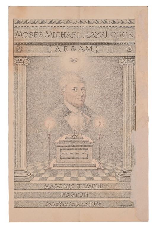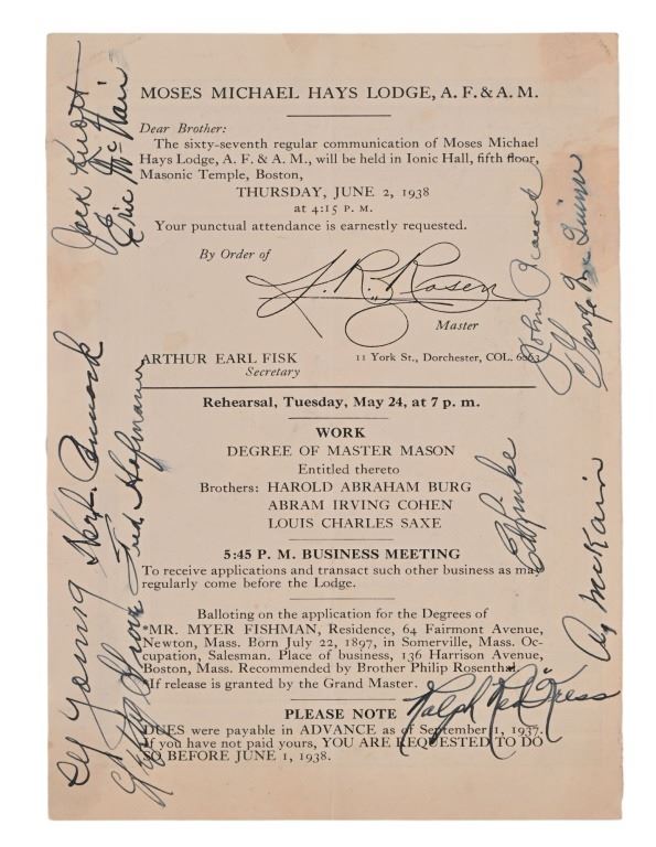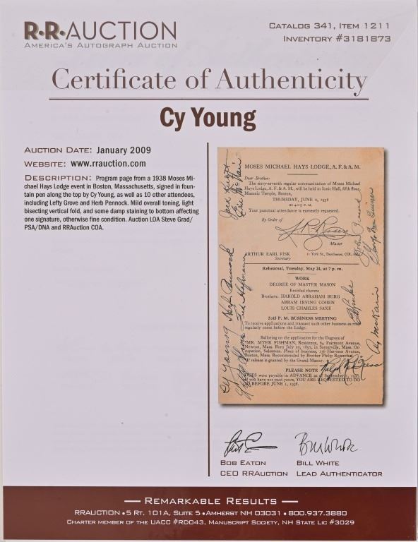 Program page June 2, 1938, from the 67th regular communication of Moses Michael Hays Lodge Masonic Temple, Boston Mass. Signed by multiple legendary baseball players including; Cy Young, Herb Pennock, Jack Knott, Lefty Grove, Fred Hofmann, Eric McNair, Ed Linke, Archie McKain, Johnny Peacock, George McQuinn, and Ralph "Red" Kress. Measures 5.5" x 8.5"