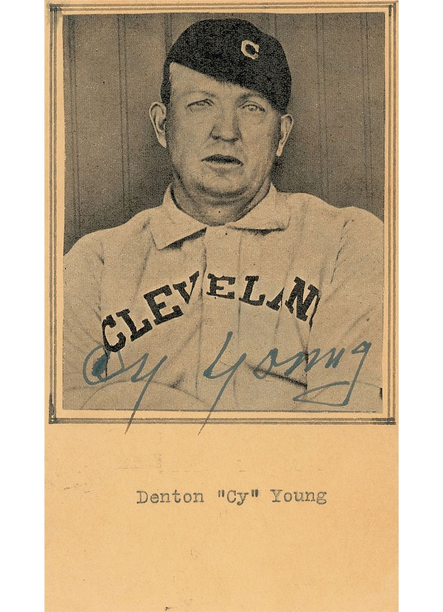 Terrific vintage 2.75 x 3.5 magazine photo of Young during his time with Cleveland affixed to a 3.25 x 5.5 government postcard, signed at the bottom in fountain pen. In fine condition.