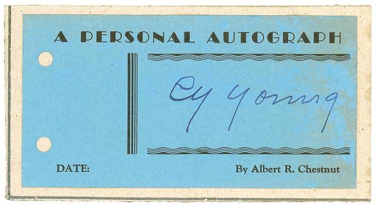 Vintage fountain pen signature, “Cy Young,” on a 5.5 x 2.75 blue card from the Albert R. Chestnut collection. Attached to a slightly larger heavy gray card and in very good condition, with scattered mottled light staining, heavier to right edge. From his Pennsylvania home, Chestnut, a printer by profession, began collecting autographs in 1935. He sent these personally-printed cards to over a thousand celebrities and received favorable replies from the vast majority, finally retiring from collecting to raise his family when postage increased from 2¢ per card! Pre-certified Steve Grad/PSA/DNA and RRAuction COA.