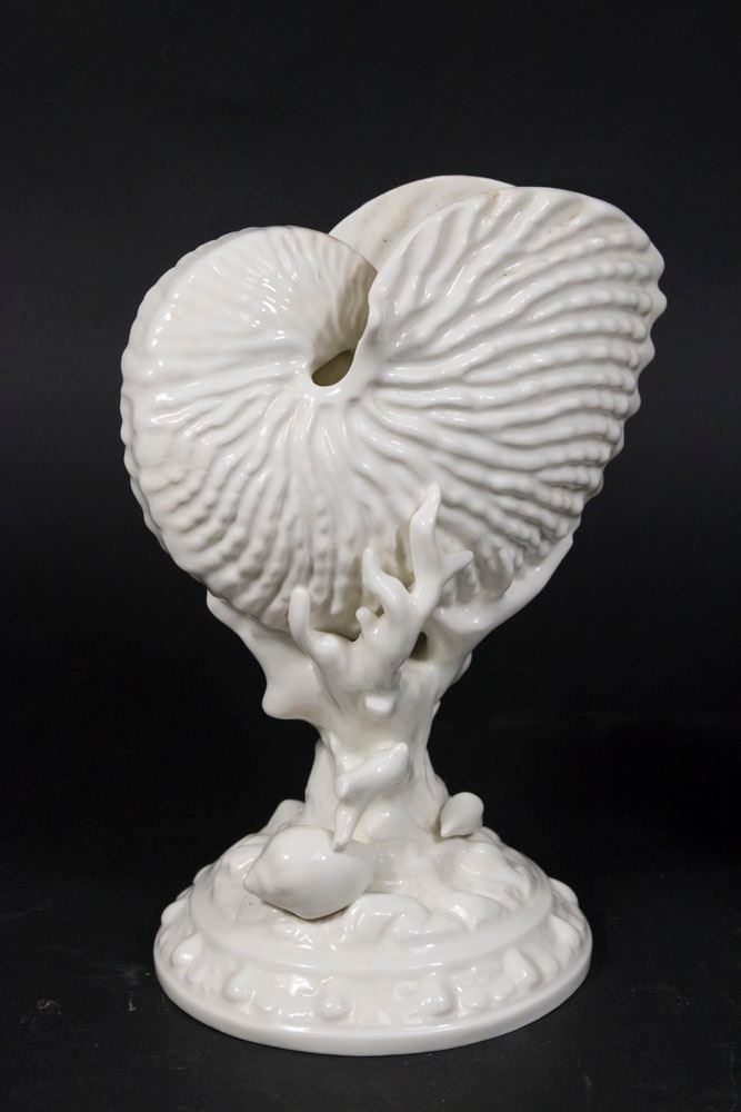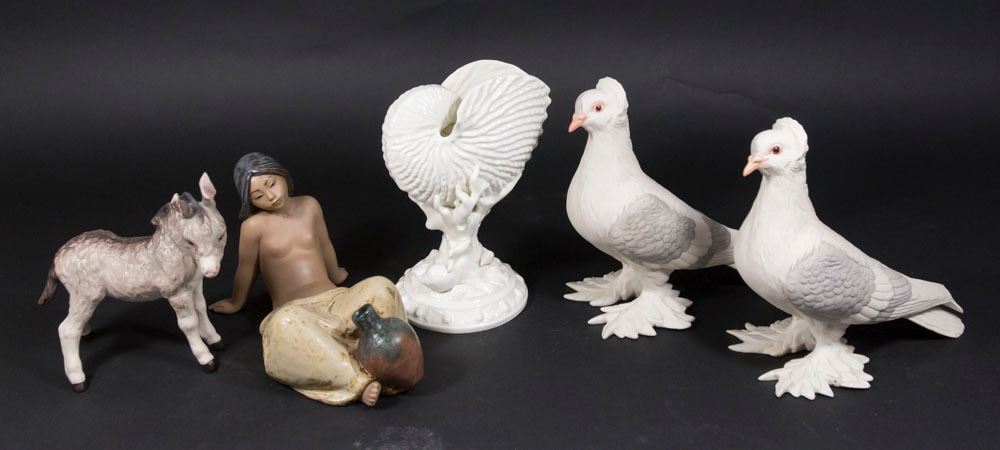 Including Lladro gres finish seminude girl, Cybis donkey, pair of Boehm tumbler pigeons, and Royal Worcester shell vase, approx. 8 1/2" H. Boehm pigeons both with losses.