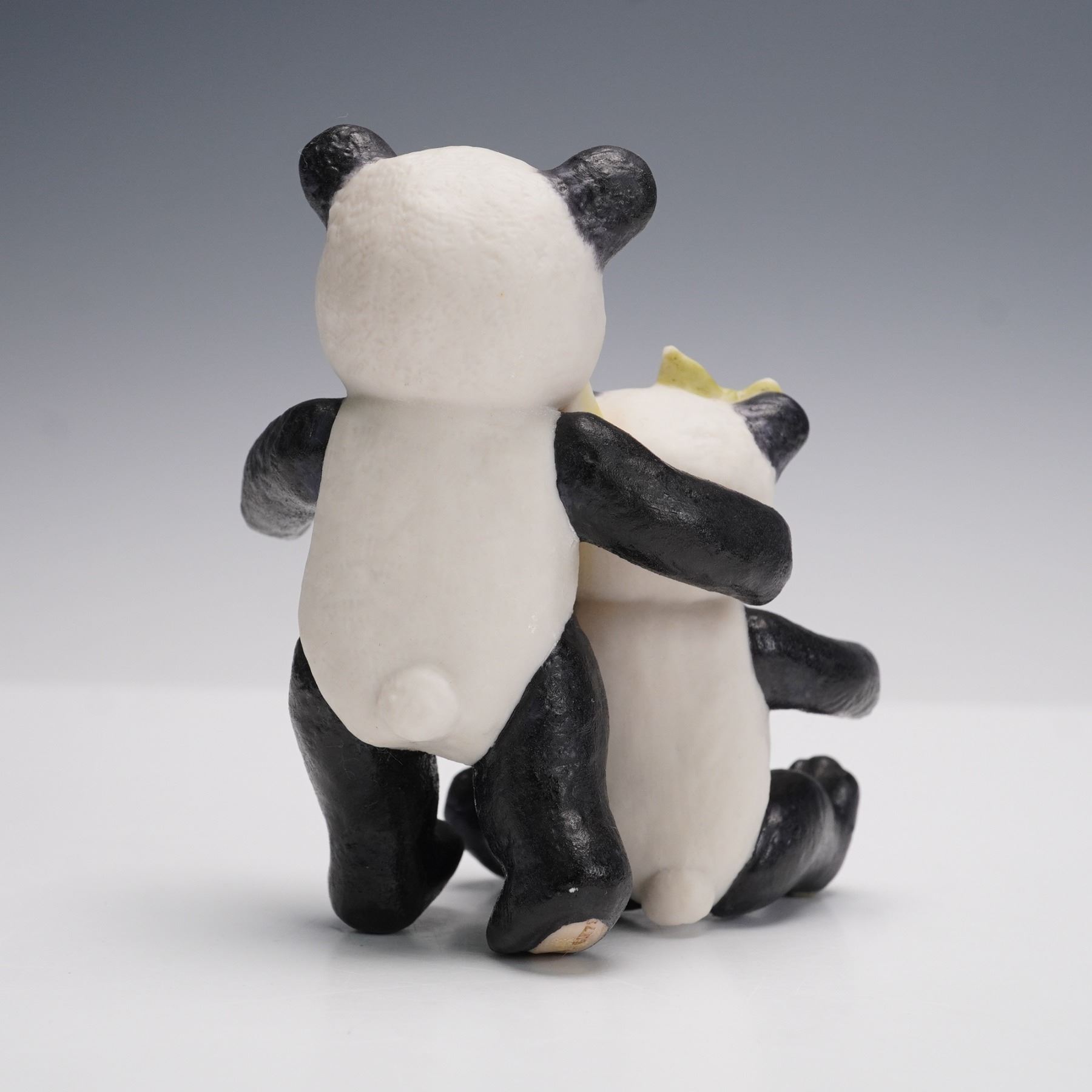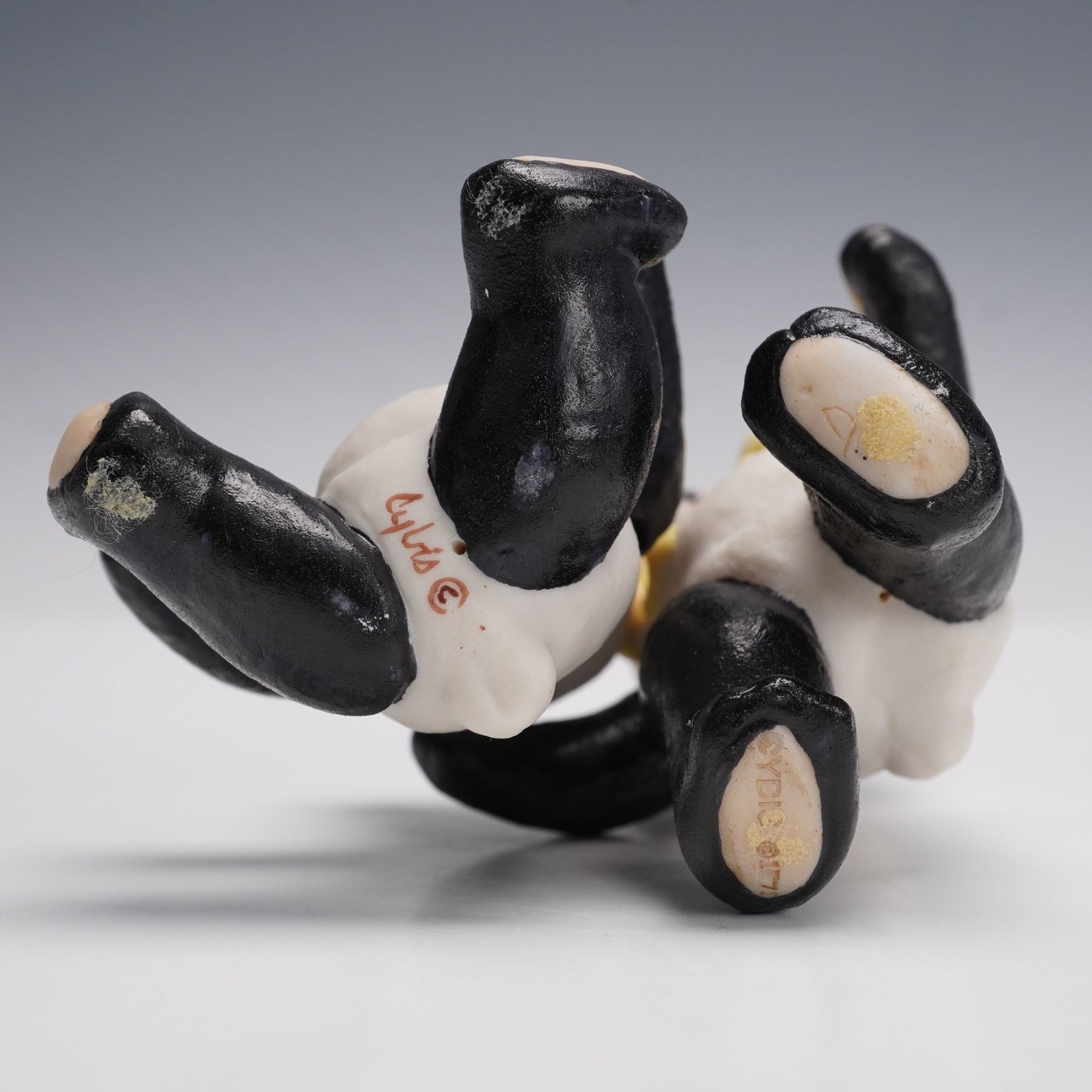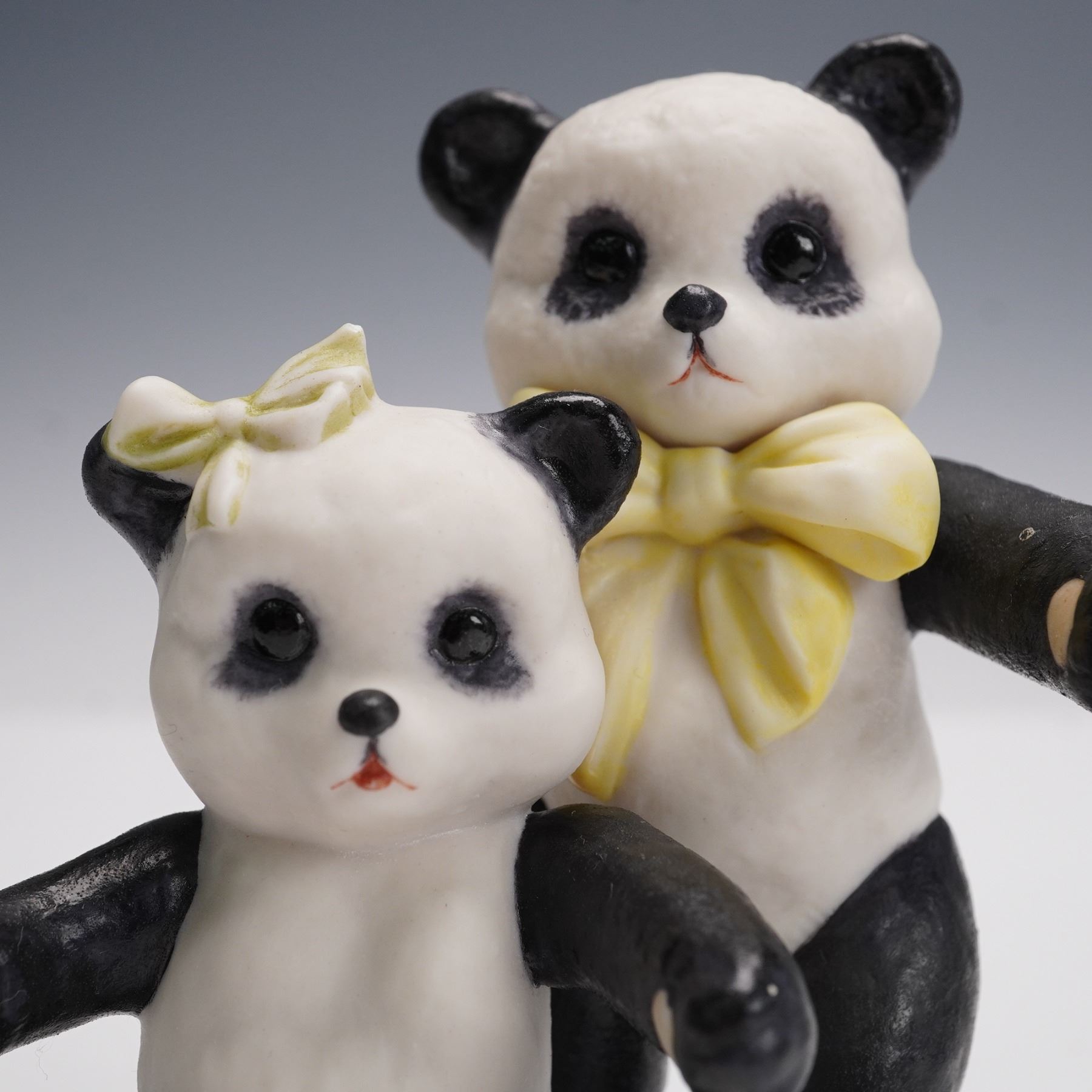 Delightful Cybis porcelain figurine featuring two pandas posed together, each adorned with a bow - yellow at the neck and green at the ear. The hand-painted details enhance their playful expressions and contrasting black and white coloration. Marked Cybis on the base.