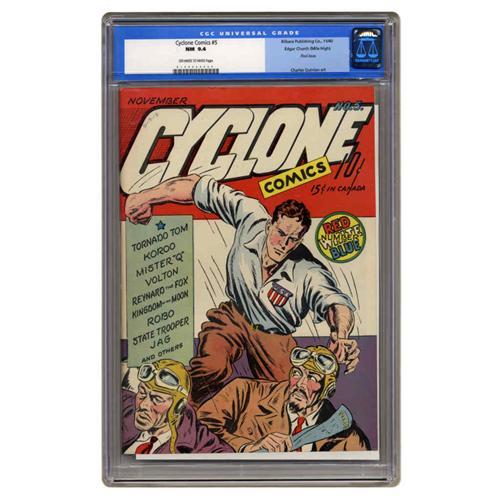 <B>Cyclone Comics #5 Mile High pedigree (Bilbara, 1940) CGC NM 9.4 Off-white to white pages.</B></I> This book's rated "scarce" by both Overstreet and Gerber, and it seems that this Edgar Church copy might be the only high-grade specimen around -- the runner-up in CGC's current census is a mere VG- 3.5. This was the last issue of the series. Charles Quinlan of <B>Catman</B></I> fame is among the issue's artists. Overstreet 2005 NM- 9.2 value = $1,075. CGC census 12/05: 1 in 9.4, none higher.