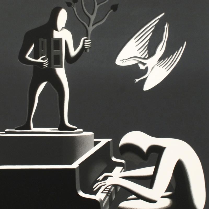 "Cyclone Variations" is a limited edition serigraph on paper, numbered and hand signed by Kostabi. Includes Certificate of Authenticity! Measures approx. 27.5" x 35.5" (with border), 21.5" x 29.5" (image).