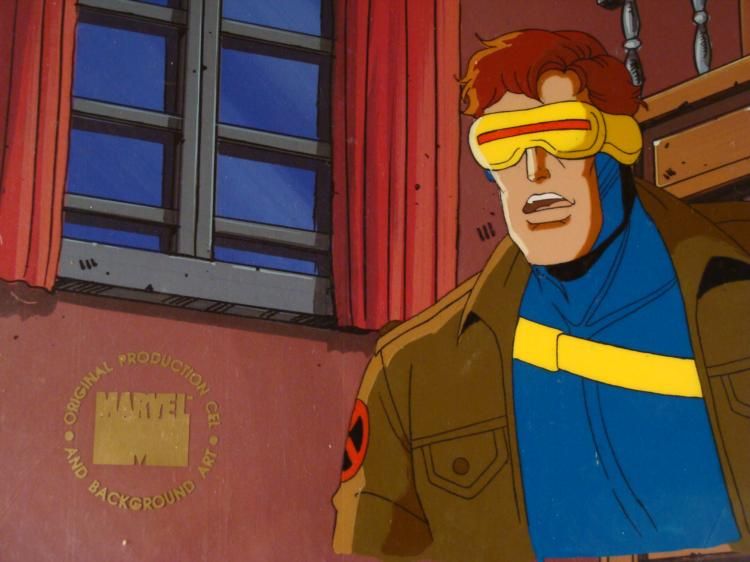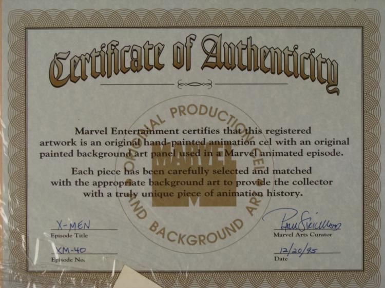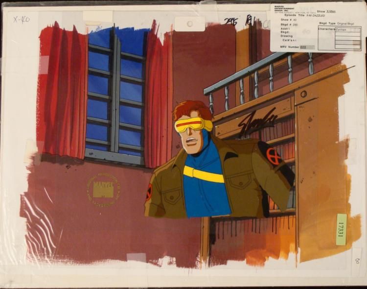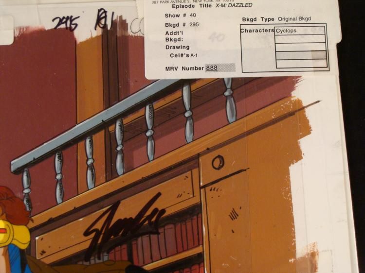 This is an original signed production cel and background from the hit series X-Men. Stan Lee signature is located on the right of cel in black sharpie. * * Under a cloud of increasing anti-mutant sentiment, Professor Xavier creates a haven at his Westchester mansion to train young mutants to use their powers for the benefit of humanity, and to prove mutants can be heroes. Xavier recruited Cyclops, Iceman, Angel, * Beast and Jean Grey calling them "X-Men" because they possessed the "x-gene", an ability normal humans lacked. Early issues introduced the team's arch enemy, Magneto and his Brotherhood of Evil Mutants, who would later battle the X-Men for years. * * Cyclops is ready for battle * * * * * Original Animated Cel & Production BackgroundMedium: Hand painted acetate celDetails: Animation notations and peg holes * * Overall Size of the Cel: 10 1/2" x 12 1/2" * Overall Size of the background: 10 1/2" x 14 1/2" * Excellent Condition * * This is an original hand-painted cel set-up used in the production of an episode of X-Men titled "Dazzled." Each one-of-a-kind set-up represents a slight change in position of the characters. When individually photographed and projected in rapid succession, * the images appear to move. * * To create production cels, the original animator's drawing is transferred onto an acetate cel (by hand-inking and/or photo copying). The cel is then hand-painted on the reverse side. The background accompanying this set-up is an original production background. * * * The cel and original background is ready to be matted and framed. The animators notations are located at the bottom of the cel and background. A Certificate of Authenticity from Marvel is on * the back of background. The Marvel Seal is located at the bottom left of the cel. The cel and background are in a protective sleeve. An information card about the episode is located at the top right of the protective sleeve. * * * *