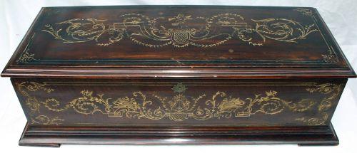 George Baker music box plays 15 1/8" cylinders. Has three combs, double spring motor, carved walnut box including cupids, instruments, and animals. Beautiful cabinet and beautiful sound. Measures 29" x 12" x 8 ½".