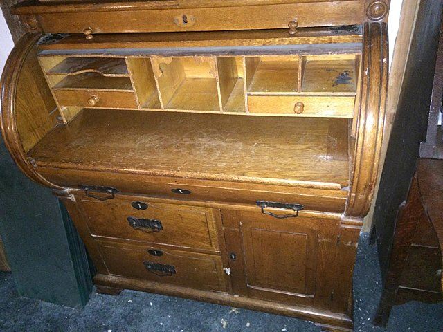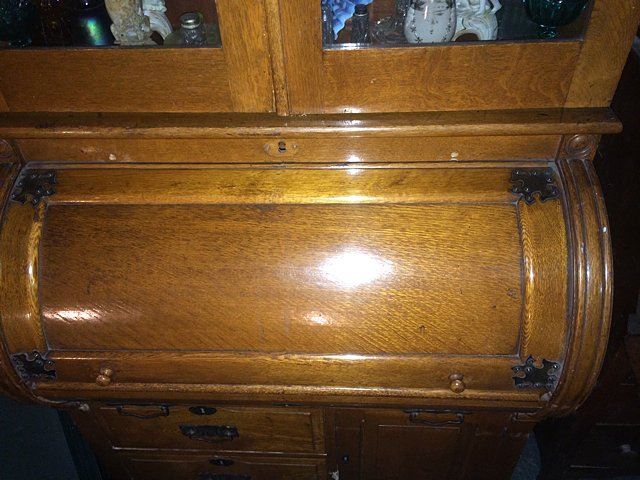 Oak Cylinder Roll Secretary Desk, 100% all original, carved crest, 2 glass doors on top with 3 shelves, pull out writing surface, beautiful original hardware, 3 drawer, 1 door below, measures approx. 36" wide x 21" deep (contents not included).