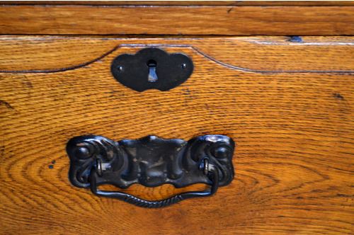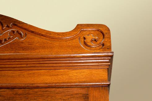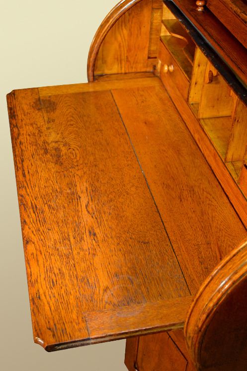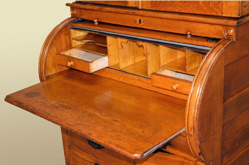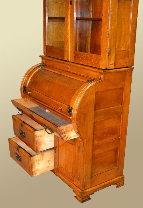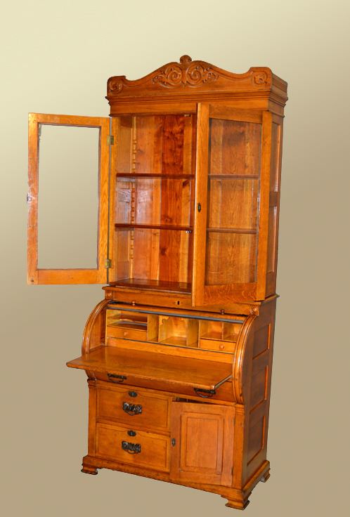 Magnificent Oak Cylinder Roll Secretary Desk, 100% all original, with carved crest, 2 glass doors on top with 3 shelves, pull out writing surface, beautiful all original hardware, 3 drawer, 1 door below, measures approx. 36" wide x 21" deep (contents not included).