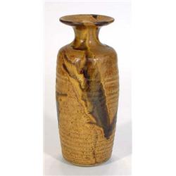 Cylindrical Colin Pearson Studio pottery vase with flared rim, decorated in browns, impressed mar…