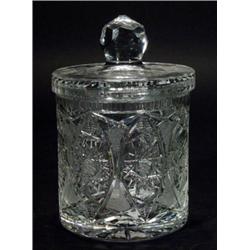 Cylindrical cut crystal biscuit barrel and cover with star cut base, 18cm high