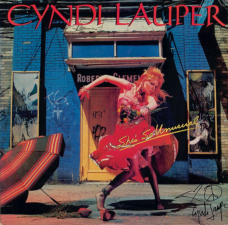 She’s So Unusual album signed on the front cover in black felt tip, with Lauper adding a small heart and peace sign. In fine condition, with some light edge dings and creases and a small separation to spine. The record is included.