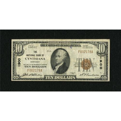 <B>Cynthiana, KY</B></I> - $10 1929 Ty. 1 <B>The NB of Cynthiana</B></I> Ch. # 1900<BR> A pleasing <B>Very Fine</B></I> with a small ink mark on the face.<BR><BR><b>Shipping:</b> Coins & Currency (<a target="_blank" href="http://www.heritageauctions.com/common/shipping.php">view shipping information</a>)