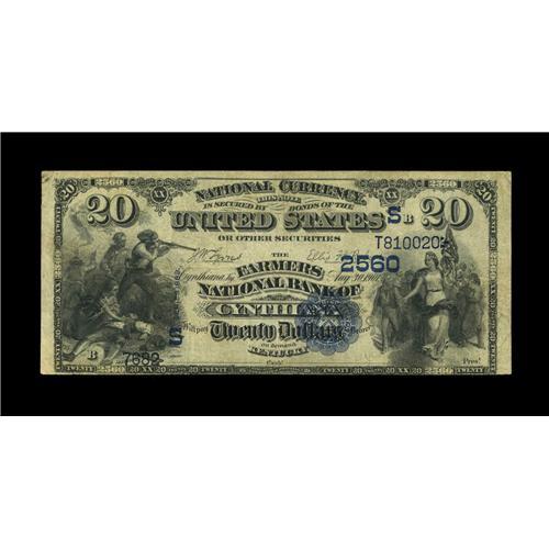 <B>Cynthiana, KY</B></I> - $20 1882 Value Back Fr. 581 <B>The Farmers NB</B></I> Ch. # 2560<BR>A <B>Fine+</B></I> example of a scarce type. Value Backs were issued only from 1916-1922 and are difficult to acquire on virtually any issuer. The census from here includes this and three others of this type and denomination. Plan on a strong bid to acquire this desirable item.