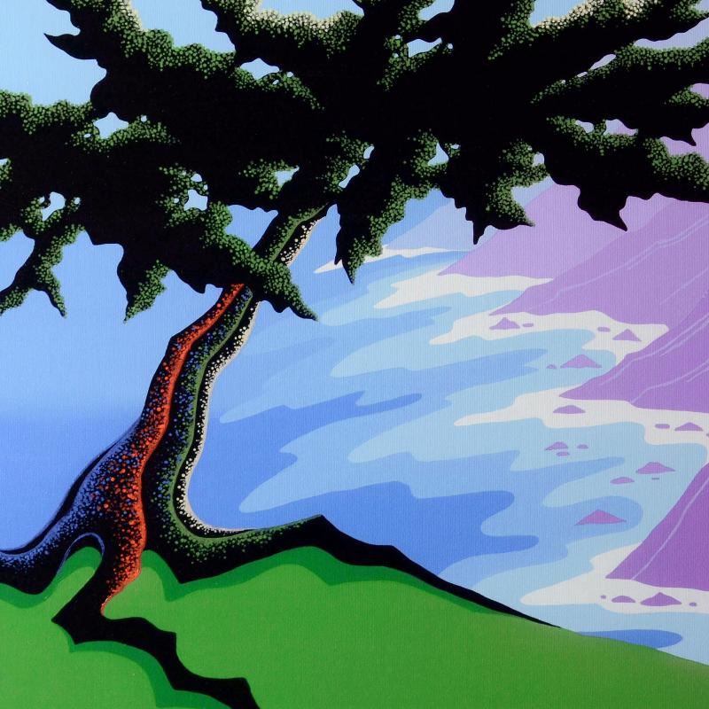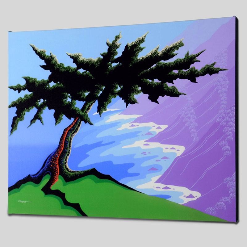 Larissa Holt, a student of distinguished artist Eyvind Earle(1916-2000), uses bold colors and breathtaking scenery to create images of Nature in her own unique style. "Cypress Point" is a limited edition giclee on stretched canvas by Holt, numbered and bearing Holt's authorized signature. This piece comes gallery wrapped with a black border, and is ready to hang. Includes Certificate of Authenticity! Measures approx. 27" x 21.5" x 1.5" (image).