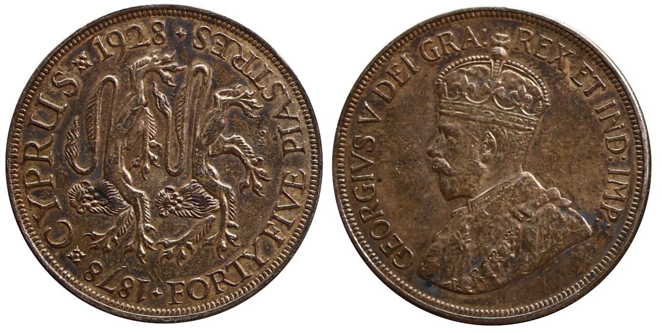 Cyprus; 1928 45 Piastres EF with underlying lustre.