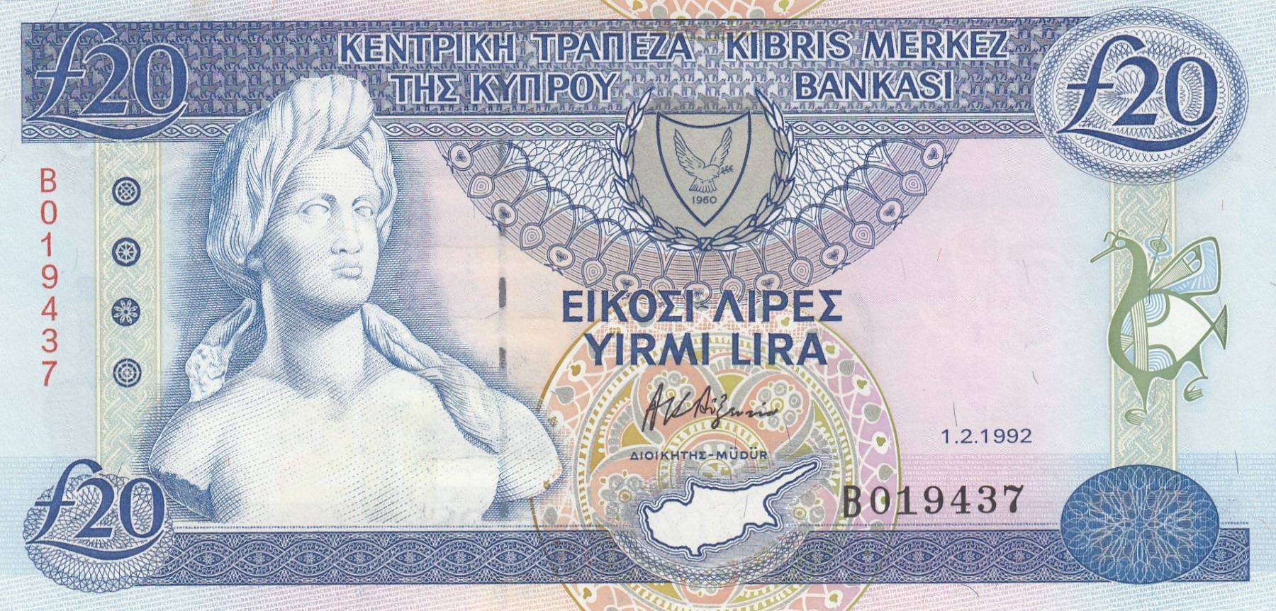 Cyprus, 20 Pounds, 1992, UNC, p56abr/serial number: B 019437