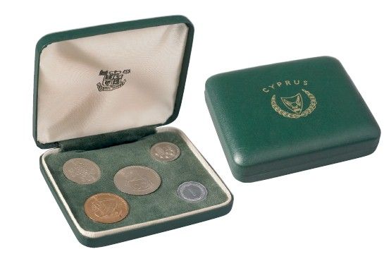 Cyprus; includes 1963 Mint sets (5 coins) in small Green Leather Case. Lot of 3 sets.
