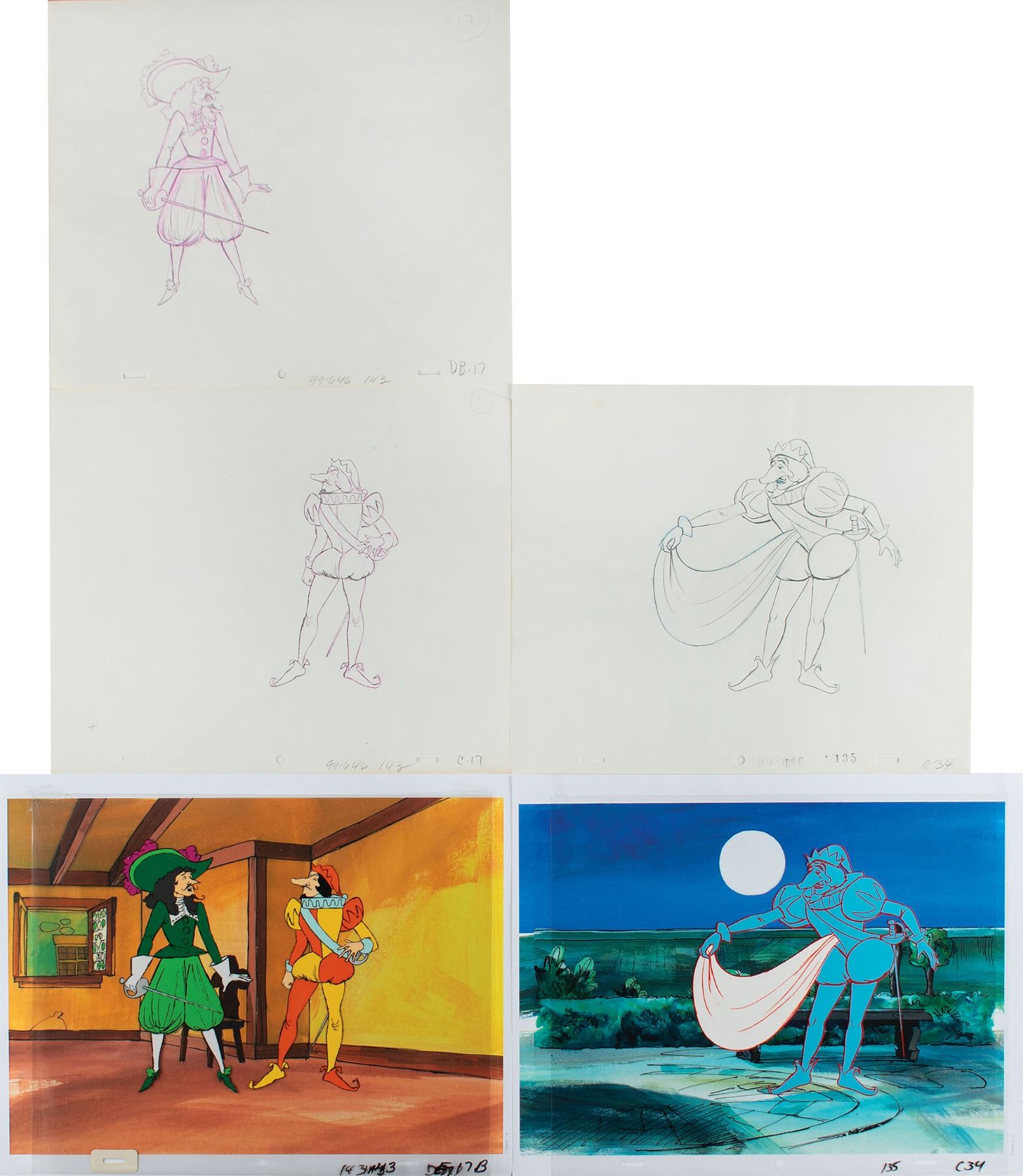 (Hanna-Barbera Studios, 1974) Two original production cels featuring Cyrano de Bergerac from the ABC after-school special Cyrano, one showing him alone and the other showing him alongside DeGuiche. Includes the original matching drawings for both. The cels are placed on color copy 14 x 11 backgrounds. In overall fine condition.