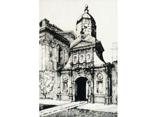 [British 1872-1951] "THE GATE OF ARMOUR" CAIN COLLEGE, CAMBRIDGE Etching; Ed. # 48/166 9 x 6 ins. Signed, titled and editioned