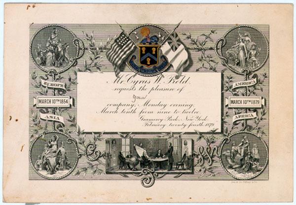 1879, New York, Elaborate invitation at the request of Cyrus W. Field to attend the celebration of the 25th Anniversary of his historic contract. The event was to be held at his Gramercy Park New York residence. Engraved and printed by Tiffany & Co. 8½ x 6”. A few brown spots and light soiling, verso shows remnants of scrapbook mounting. Very Good and Rare. There were only 1800 guests invited this private event with just 1000 attending. In 1854 Cyrus Field signed a contract which would change both his own life and the history of communications. Through the dauntless efforts of this man, the Atlantic Cable that connected North America and Europe came to fruition. Since that time, the two continent have never been out of immediate communication with each other. The card was designed to represent submarine Telegraphy, linking together with its chain of light the four quarters of the globe. In the centre is a white space of the size of an ordinary visiting card, on which is engraved the invitation. Above this is the coat-of-arms of the Field family, which consists of a shield, with a black ground, parted by a chevron of silver, with sheaves of wheat in gold. The crest shows an arm emerging from a cloud, and grasping the world. This is derived from an ancestor of the family, John Field, a distinguished English astronomer, who lived two hundred years ago, and who introduced the Copernican astronomy into England. A more appropriate design could hardly be found for one who has united the Hemispheres. On one side is an American and on the other an English flag, the staffs of which cross behind the shield. The allegorical figures of the four quarters of the globe will be recognized by all Englishmen as taken from the designs on the Albert Memorial Monument in Hyde Park, London. Europe is seated on a bull, the emblem of strength, crowned, holding a sceptre in her right hand and in her left a globe, surmounted by a cross, while at her feet are three symbolic figures, one holding a sceptre, one with an anchor and a wreath, and the third in an attitude of instruction. America appears as an Indian, with spear and shield, seated on a bison, with a native warrior behind, while in front a figure of civilization stretches out its wand over the new world. Asia reposes on a kneeling elephant, attended by Brahmin and Buddhist priests; and Africa is perched on the hump of a camel, with Oriental figures around her. A cable winds around the whole card, making a frame to the medallions. On one side is the date of the origin of the Company, March 10, 1854; and on the other, that of the reception, March 10, 1879. At the foot is the representation of Mr. Field's dining-room, and the six gentlemen who met therein to launch the first cable - Cyrus W. Field, Peter Cooper, Moses Taylor, Marshall O. Roberts, Chandler White, and David Dudley Field. [From The 25th Anniversary of the Organization of the First Company Ever Formed to Lay an Ocean Cable. Printed for private circulation only, 64 pages, 1879.]