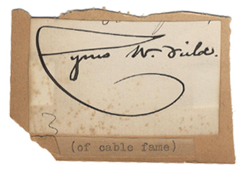 CYRUS W. FIELD (1819-1892). Capitalist; Telegraphy pioneer; Promoter . Field was the driving force behind the first telegraph cable across the Atlantic ocean. After unsuccessful attempts in 1857-58, Field succeeded in laying a working cable between Ireland and Newfoundland in August 1858, only to have it fail four weeks later. He finally succeeded in laying a working cable in 1866. Field then went on to help establish elevated railroads in New York City, and to collaborate with Jay Gould in various railroad projects. Signature. 2 5/* x 1 5/8". Some light foxing. Fine.