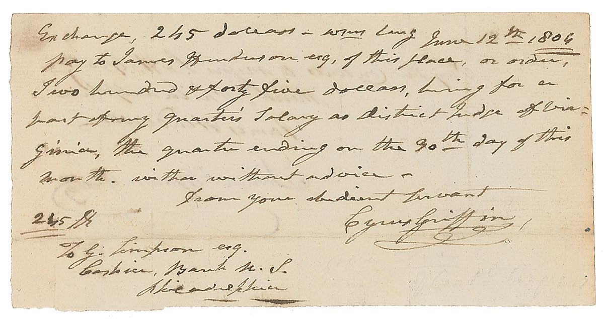 ADS, signed “Cyrus Griffin,” one page, 7.75 x 3.75, June 12, 1806. Document ordering a payment to James Henderson of "Two hundred & forty five dollars, being for…salary as district judge of Virginia, the quarter ending on the 30th day of this month." Signed at the conclusion by Griffin as judge of the United States District Court for the District of Virginia. In fine condition.
