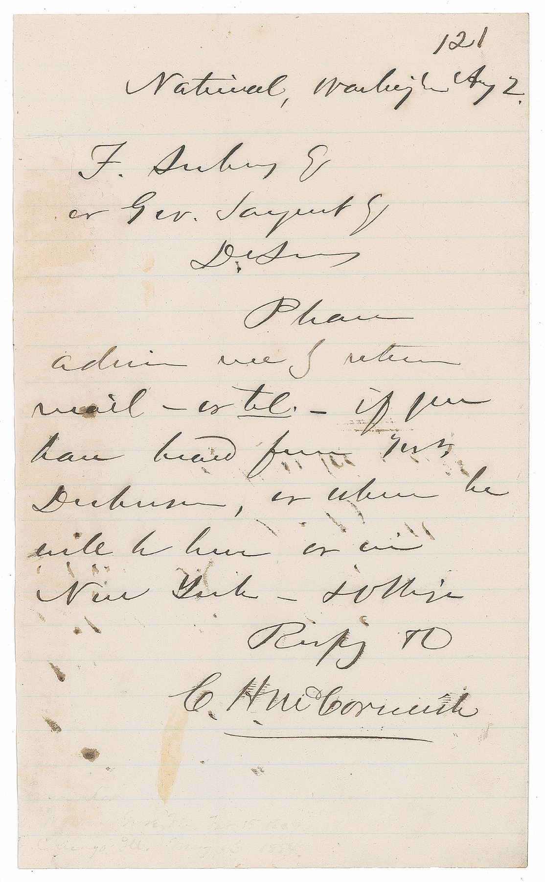 Inventor and businessman (1809-1884) whose reaper revolutionized American agriculture. Scarce ALS signed “C. H. McCormick,” one page, 4.75 x 8, August 2, no year. In full: "Please advise using return mail—or tel.—if you have heard from Mr. Duburn, or when he will be here or in New York." In very good to fine condition, with trimmed edges, scattered light creasing, and old mounting remnants on the reverse.