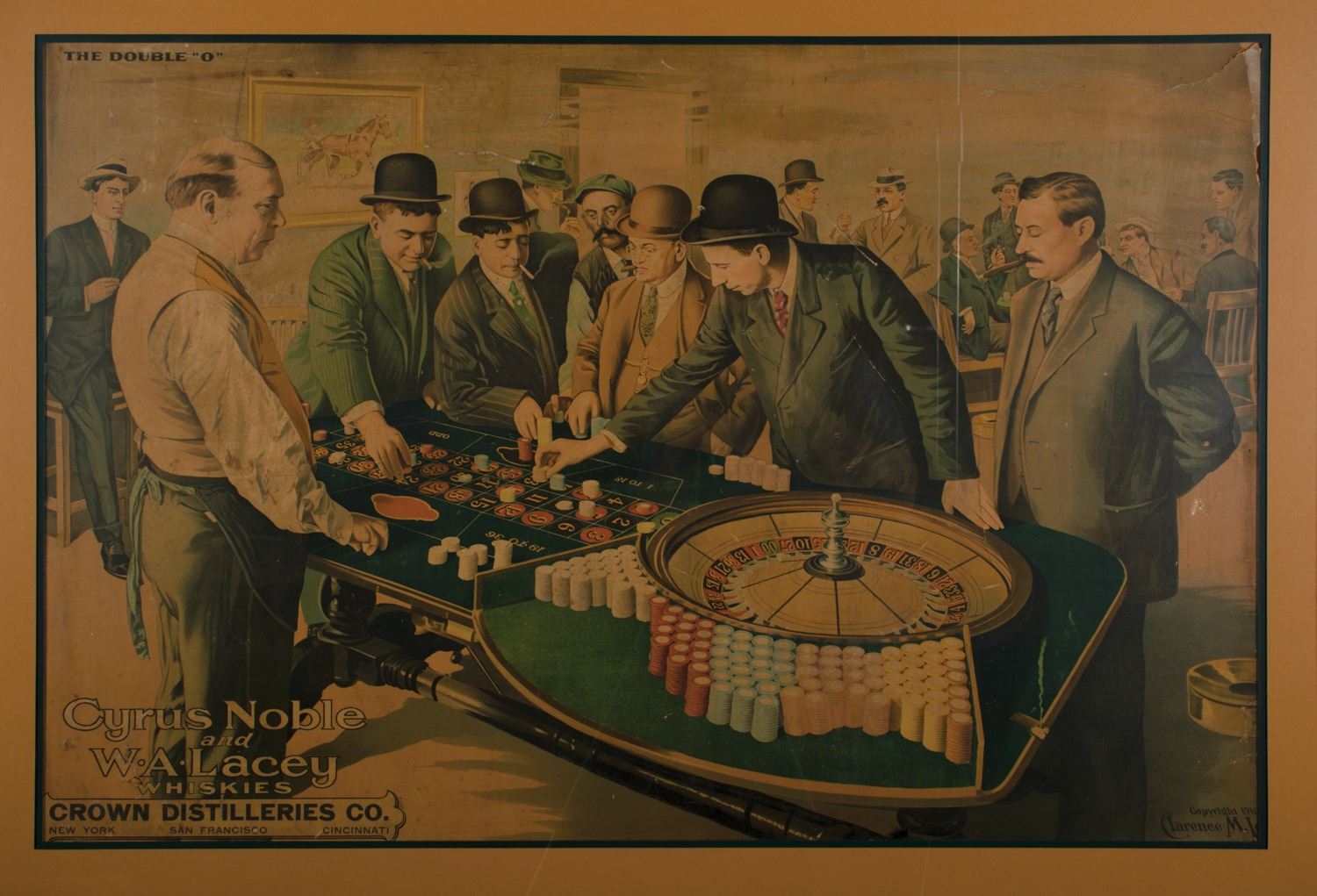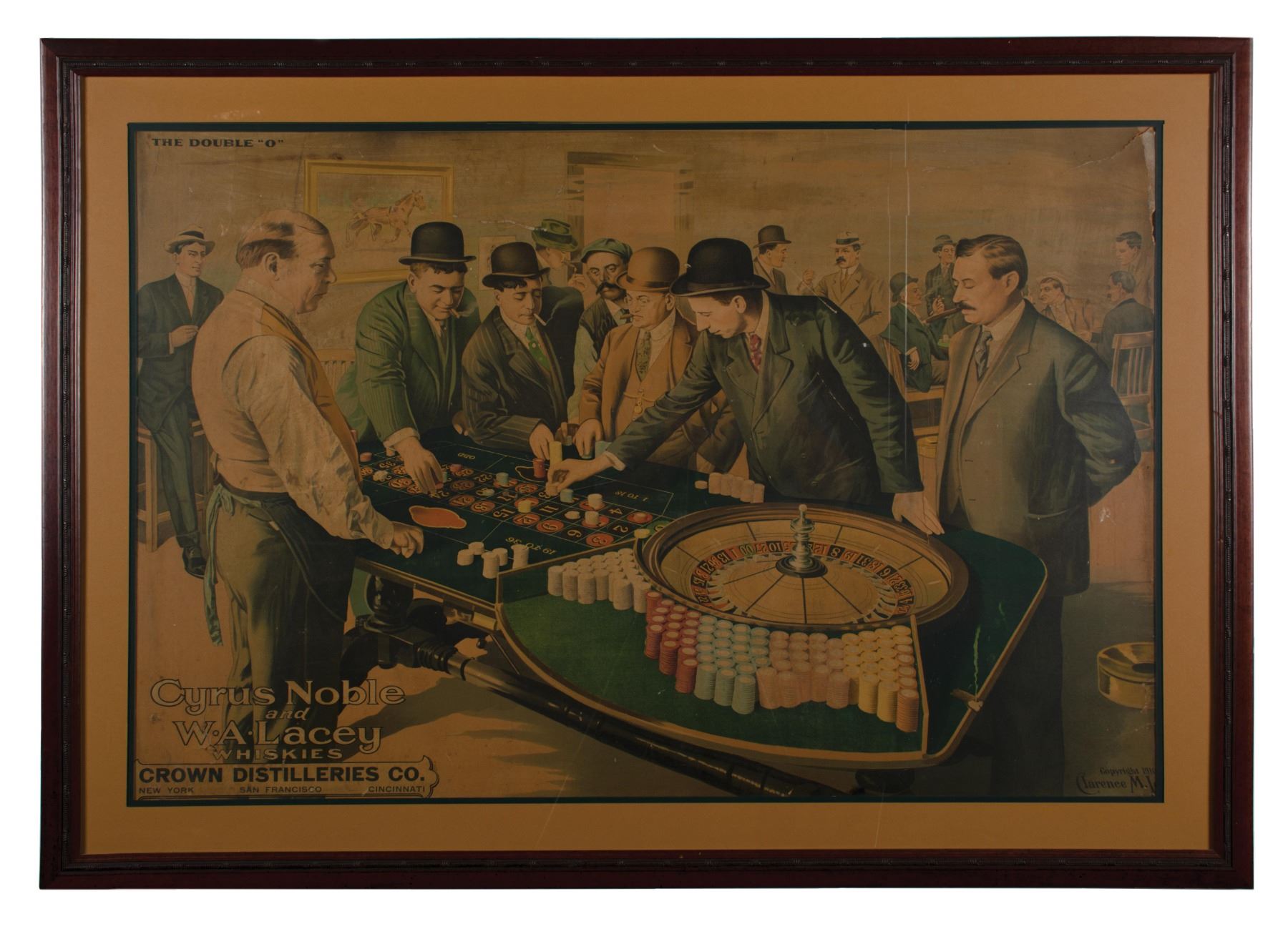 Scarce Cyrus Noble original lithograph poster, titled "THE DOUBLE 'O'" in upper left. Image is of men gathered around a roulette table in a gaming hall. A rare and desirable image. Advertising at bottom left and right: "Cyrus Noble and W. A. Lacey Whiskies / Crown Distilleries Co. - New York - San Francisco - Cincinnati" & "Copyright 1910 / Clarence M. Leavy." Darkening to the image, shows some cracking at the corners, no paper loss. Not examined out of frame. 26" x 39" sight, framed to 32" x 46".