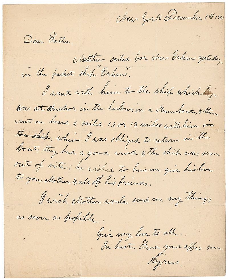 American industrialist (1819–1892) who financed the first permanently operational transatlantic telegraph cable. ALS signed “Cyrus,” one page, 8 x 9.75, December 1, 1835. At the age of 16, Field writes his father, the Rev. D. D. Field, a pastor in Stockbridge, Massachusetts, regarding a trip to New Orleans on which a friend was embarking. In part: “I went with him to the ship which was at anchor in the harbor, in a Steamboat, & then went on board & sailed 12 or 13 miles with him, when I was obliged to return in the boat.” Field has crossed out a few words as a means of correction. In very good condition, with several intersecting folds, two small areas of paper separation, scattered soiling, and light brushing to the signature.