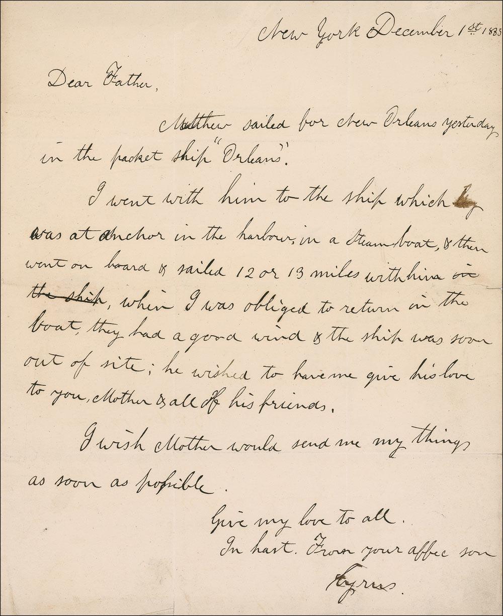 American industrialist (1819–1892) who financed the first permanently operational transatlantic telegraph cable ALS signed “Cyrus,” one page, 8 x 9.75, December 1, 1835. At the age of 16, Field writes his father, the Rev. D. D. Field, a pastor in Stockbridge, Massachusetts, regarding a trip to New Orleans on which a friend was embarking. In part: “I went with him to the ship which was at anchor in the harbor, in a Steamboat, & then went on board & sailed 12 or 13 miles with him, when I was obliged to return in the boat.” Field has crossed out a few words as a means of correction. In very good condition, with several intersecting folds, two small areas of paper separation, scattered soiling, and light brushing to the signature.