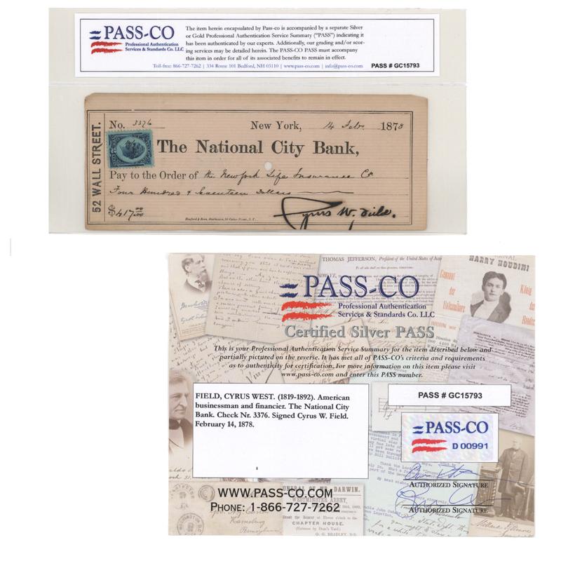 CYRUS WEST FIELD (1819-1892) American businessman and financier. The National City Bank check #3376 Signed “Cyrus W. Field.” New York. February 14, 1878. Revenue stamp affixed. Punch cancellations do not affect Field’s signature. This item has been encapsulated by PASS-CO, LLC. and is accompanied by a Certified Silver Pass.