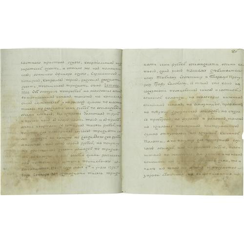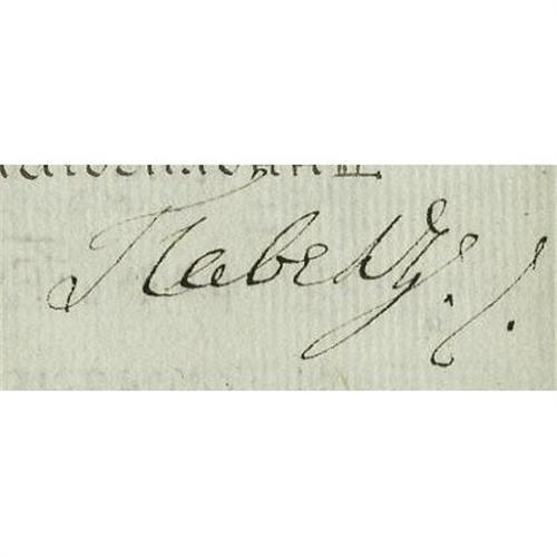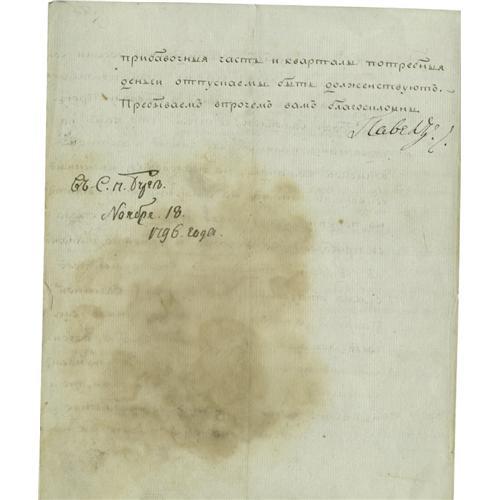 <B> Czar Paul I Letter Signed,</B></I> 4 pages, 7.5" x 9.0", St. Petersburg, November 18, 1796 to General Nikolai Petrovich Arkharov . Paul I (1754-1801), son of Catherine the Great, reigned 1796-1801. This letter, written shortly after his succession, is in the precise Cyrillic hand of an Imperial Court scribe. Paul's signature follows the text wherein he imparts his plans for military reorganization and pay. The letter comes with a complete translation. A rare and highly collectible item from a very short-lived Czar. Large area of foxing not affecting the signature. Very Good condition. <BR><BR><B>Important noti