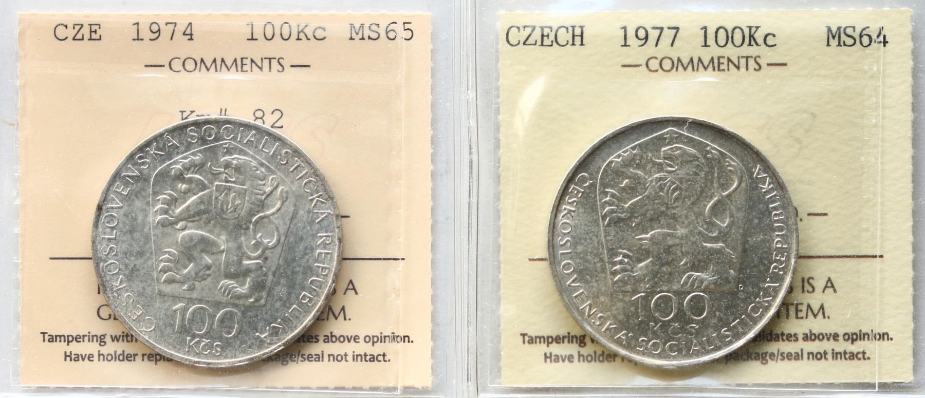 Czech; 1974 100Kc, 1977 KM#82 Both coins ICCS MS64 & MS65.