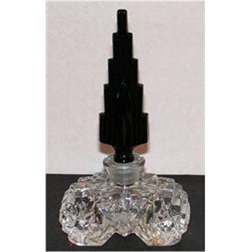 Produced in the Czech Republic during the 1990s this pressed glass perfume bottle features a black stepped stopper shaped like a tower with a rounded and stepped crystal glass base. Measures 6 inches tall x 3 inches across the base and is in excellent condition.