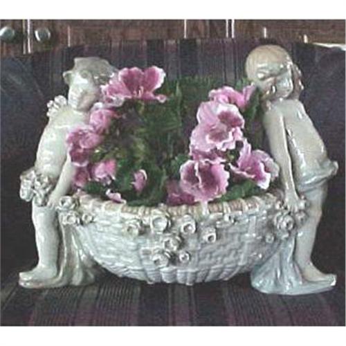 It features two beautiful children a boy and a girl. They balance a basket weave porcelain basket applied with pale pink roses. The piece has some condition issues. There are several factory stress cracks and a poor repair of one at the underside at the boy's foot. Both are easily repaired and do not deflect from the charm or use ability of the vase.