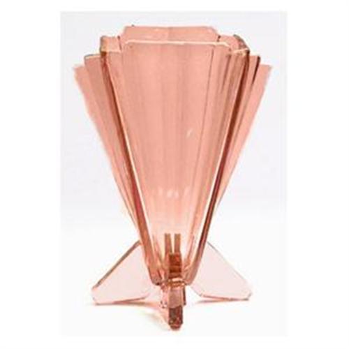 Produced in Czechoslovakia circa 1930 this pink Depression glass Art Deco Rocket vase features three Machine Age design legs a stepped or winged vase. Measuring 5 1/2 inches tall and is in excellent condition